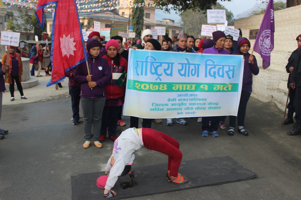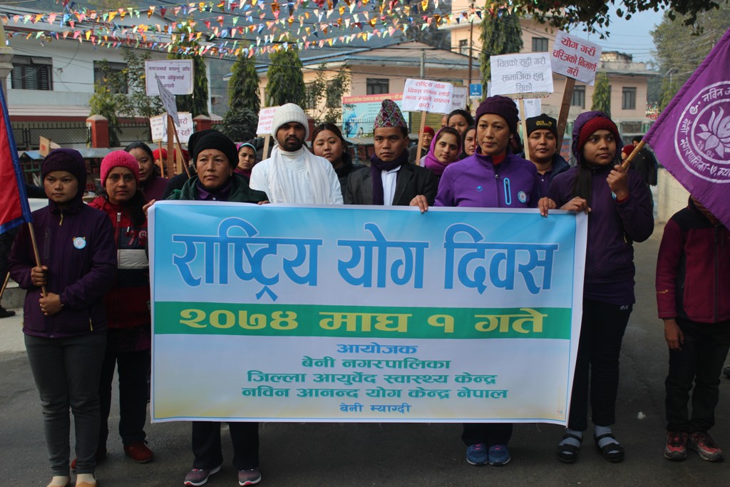 स्वस्थ्य खानपान र अनुशासित जीवनशैलीसंगै योगलाई जीवनको एउटा हिस्सा बनाउनुपर्ने जोड दिए । बदलिँदो जीवनशैली, गलत खानपानले मानिसहरू विभिन्न रोगबाट ग्रसित हुने गरेको बताउँदै योग साधनालाई हरेक दिन प्रयोग गर्नुपर्नेमा जोड दिए । तेस्रो राष्ट्रिय योग दिवसको अवसरमा बेनी नगरपालिका, जिल्ला आर्युवेद स्वास्थ्य केन्द्र र नविन आनन्द योग केन्द्रले बेनीमा आयोजित कार्यक्रममा बोल्ने बक्ताले योगले परिवार, समाज र राष्ट्रलाई प्रत्यक्ष, अप्रत्यक्ष फाईदा हुने भएकाले पनि योगको महत्वका बारेमा सहर देखी गाउँसम्म पु¥याउनुपर्नेमा जोड दिएका थिए ।
