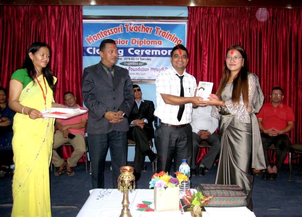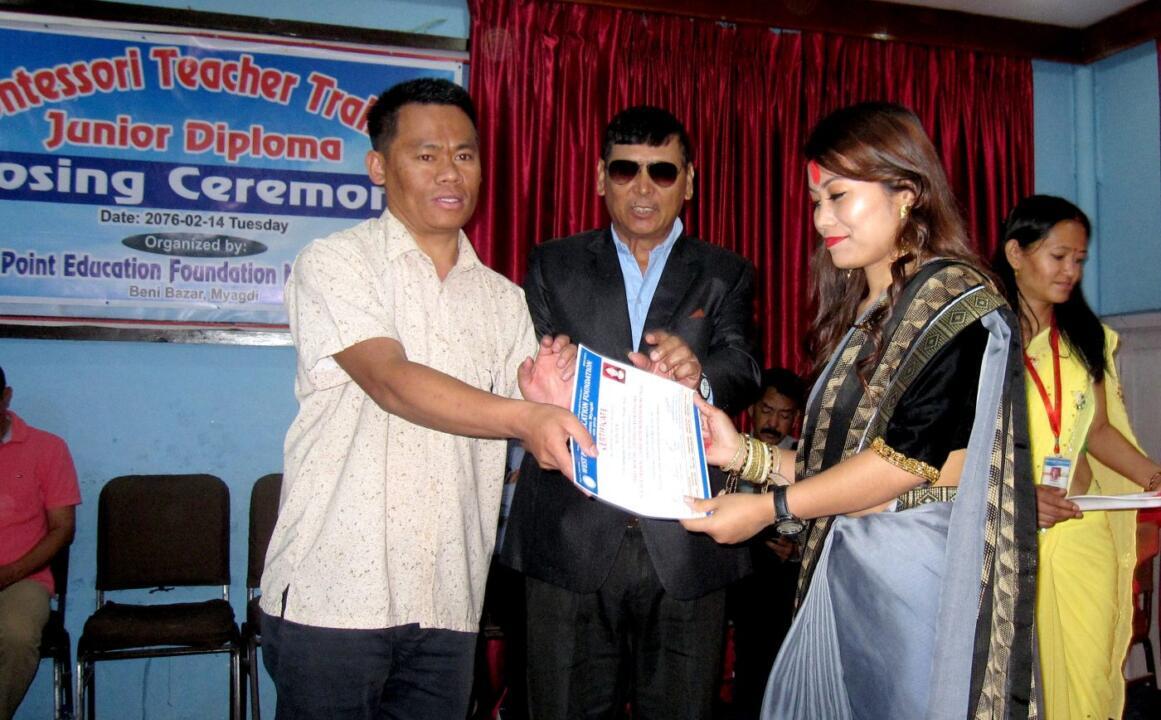न्यु वेष्ट पोइन्टमा संचालित मंटेसरी शैक्षिक तालिम सम्पन्न भएको छ । गत चैत्रबाट संचालन भएको जुनियर डिप्लोमो मंटेसरी तालिम एक कार्यक्रमबीच समापन गरिएको हो । तालिममा सहभागी २४ जना सहभागीलाई तालिमको प्रमाण पत्र प्रदान गरिएको छ । समापन कार्यक्रमका प्रमुख अतिथि जिल्ला शिक्षा सामान्य इकाई म्याग्दीका प्रमुख दलबहादुर थापाले प्रशिक्षार्थीलाई प्रमाण पत्र प्रदान गर्नु भएको हो ।