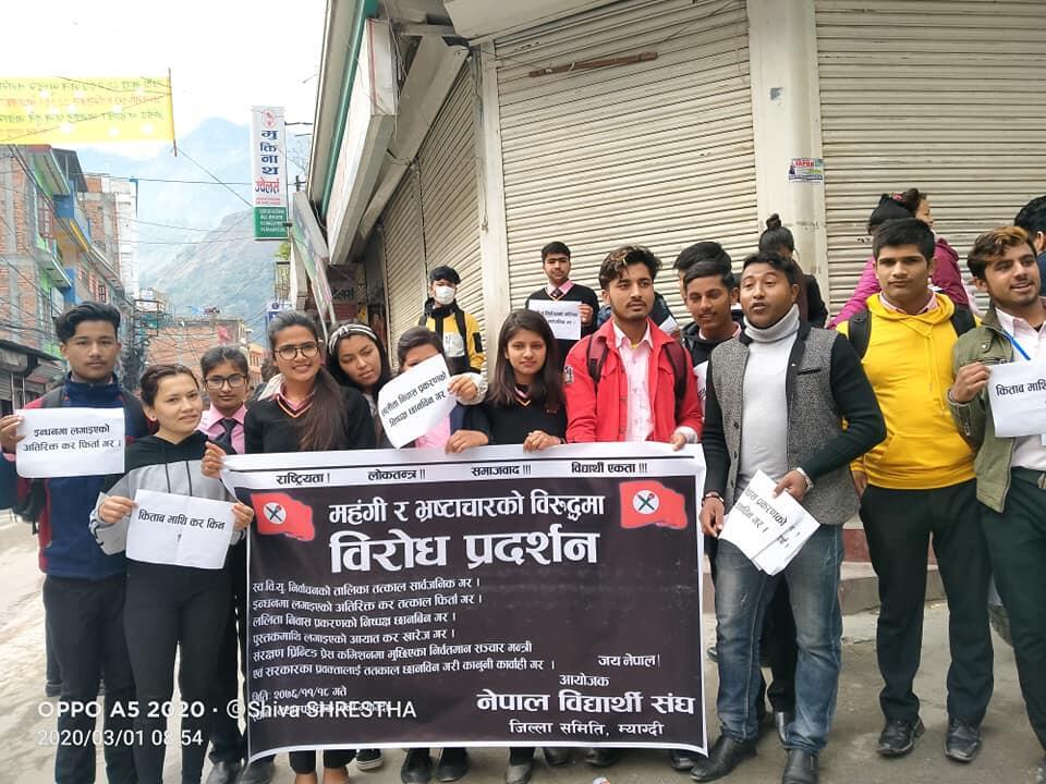नेपाली कांग्रेसको भ्रातृ संस्था नेपाल विद्यार्थी संघ म्याग्दीले पुस्तकमा लगाएको मूल्यवृद्धि फिर्ता लगायत विभिन्न माग गर्दैै बेनीमा विरोध गरेको छ ।