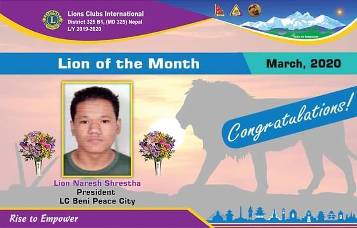 विश्वभर फैलँदै गैरहेको कोरोना भाइरस (कोभिड–१९)को रोकथामका लागी खाद्यान्न सहयोगसँगै जनचेतनामुलक कार्यक्रममा सक्रिय बेनीको लायन्स क्लव पिस सिटीका अध्यक्ष नरेश श्रेष्ठले लायन्स क्लब इन्टरनेशनल डिस्ट्रिक ३२५ बि वान नेपालबाट ‘लायन अफ दी मन्थ’ अवार्डबाट सम्मानित भएका छन् ।
