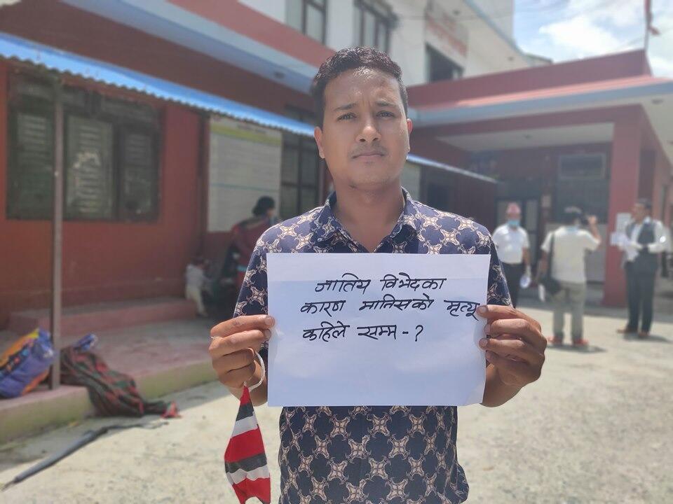 जातिय विभेदका कारण मानिसको मृत्यु कहिलेसम्म ? ‘नेपाली हुनुको गर्व लाग्थ्यो होला सायद मानिस, मानिस बिच विभेद नहुने भए’ जस्ता भन्ने नारा लेखिएका प्लेकार्ड सहित जिल्ला प्रशासन कार्यालयमा पुगेका विभिन्न १४ दलित संघसंस्थाका अगुवाले प्रमुख जिल्ला अधिकारी ज्ञाननाथ ढकाललाई ज्ञापन पत्र बुझाएका हुन् ।