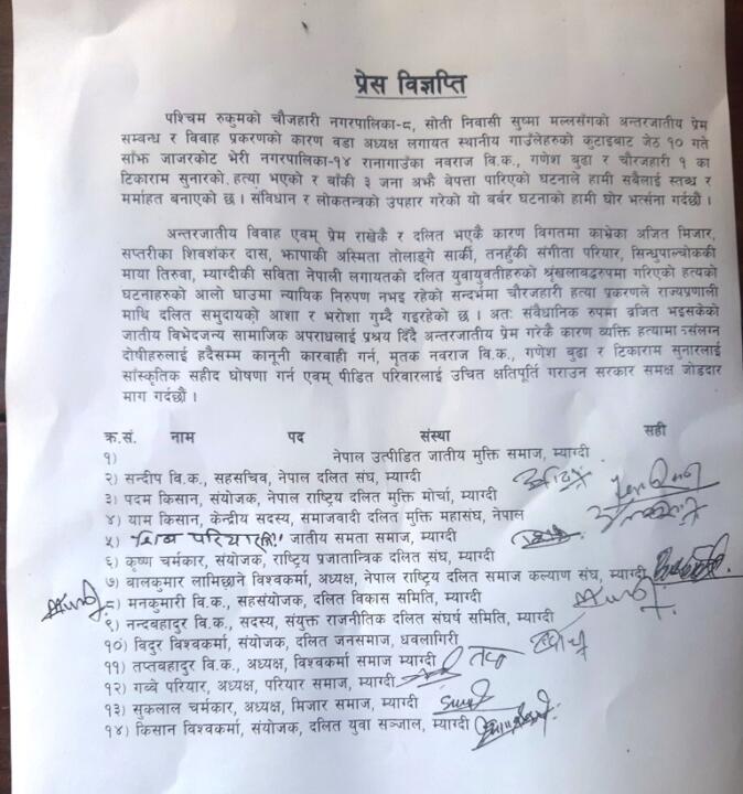 दलित अगुवाहरुले अन्तरजातिय विवाह गर्न खोजेकै कारण हत्या गरिएको घटनाको निष्पक्ष छानबिन गरी दोषिलाई कारवाहीको माग गरेका हुन् । जातिय विभेदका कारण दलितमाथी निरन्तर देशभरी भइरहेका आक्रमणको निष्पक्ष छानबिन गरी दोषीलाई संविधानले तोके अनुसारको कारवाहीको माग गदैं कारवाहीमा आलटाल गरिए चरणबद्ध आन्दोलनको चेतावनी समेत दिएका छन् ।