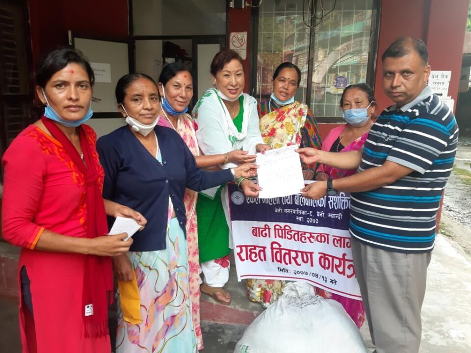 जिल्लाभित्रका विभिन्न स्थानमा बाढीपहिरोले विस्थापित जिवन विताइरहेका महिला, बालबालिकालाई लक्षित गरी करिब ३० हजार बराबरको लत्ताकपडा केन्द्रकी अध्यक्ष देवी केसी, संस्थापक अध्यक्ष बिमला गौचनले प्रमुख जिल्ला अधिकारी ज्ञाननाथ ढकालमार्फत हस्तान्तरण गर्नुभएको थियो ।