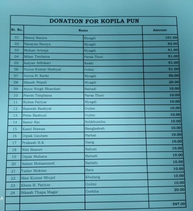 पुनको उपचारमा बानियाँ कार्यरत कम्पनीका नेपालीले १८ हजार ४०६ रुपैयाँ राष्ट्रिय जनजागृति माविका प्रधानाध्यापक टेक राम्जालीमार्फत हस्तान्तरण गरिएको हो ।