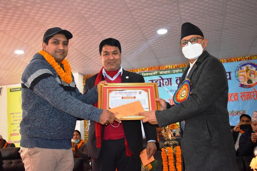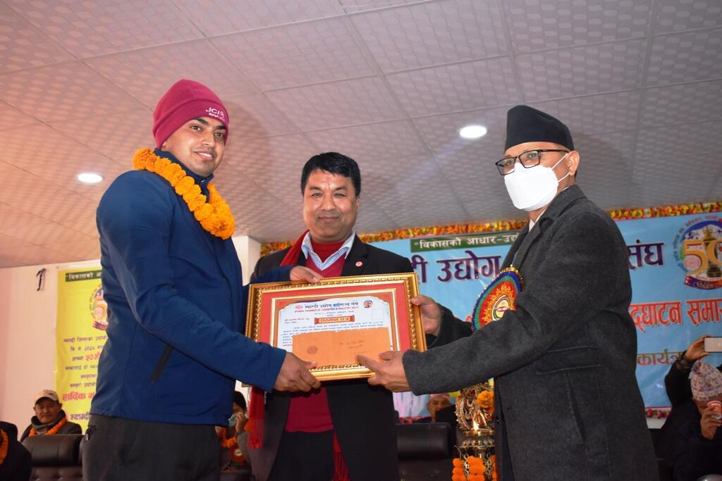 शनिबार सदरमुकाम बेनीमा आयोजित साधारणसभामा कार्यक्रमका प्रमुख अतिथि राष्ट्रिय सभाका अध्यक्ष गणेशप्रसाद तिमिल्सिना र म्याग्दी उद्योग वाणिज्य संघका अध्यक्ष उत्तमकुमार कर्मचार्यले नगद २५ हजार रुपैयाँ सहित सम्मानपत्रले सम्मान गरेका छन् ।