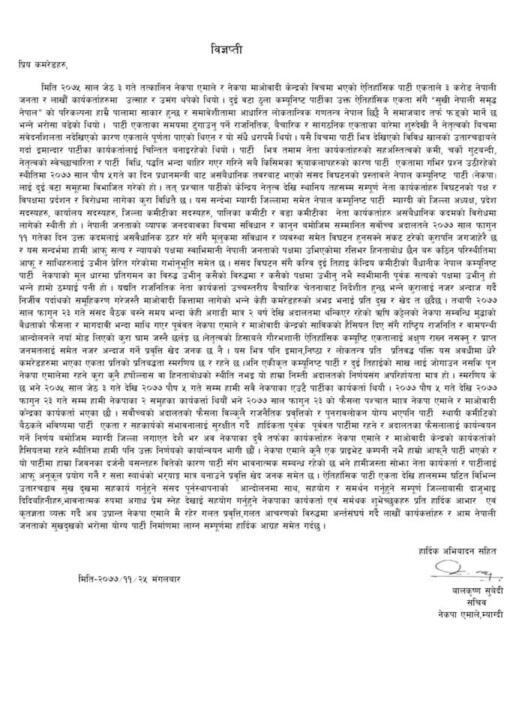 पार्टी एकता अघि तत्कालिन नेकपा एमालेको सचिब समेत भैसक्नुभएका नेता सुवेदी पार्टीको प्रचार विभाग प्रमुख समेत हुनुहुन्छ । प्रधानमन्त्री केपी शर्मा ओलीले प्रतिनिधि सभा विघटन गरेपछि विभाजित अबस्थामा पुगेको नेपाल कम्युनिष्ट पार्टीको प्रचण्ड(माधव पक्षले ६८ जिल्लाको नेतृत्व चयन गरेको छ ।