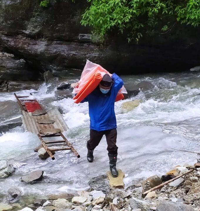 म्याग्दीको अन्नपूर्ण गाउँपालिका–७ हिस्तान र वडा नं ८ राम्चेको सिमानामा पर्ने संसारे खेलामा खाद्यान्न बोकेर तदैं गरेका गाउँपालिका अध्यक्ष डमबहादुर गर्बुजा पुन र राम्चेका वडा अध्यक्ष वडाअध्यक्ष खमबहादुर गर्बुजा । बाढीपहिरोबाट विस्थापितलाई राहत तथा पुर्नबास अभियानका साथै वडास्तरको अनुगमनको क्रममा खोलाबाट खाद्यान्न बोकेर अध्यक्ष गर्बुजा सहित स्थानीय जनप्रतिनिधिको टोली राम्चे र काफलडाँडा पुगेको थियो । तस्वीर सौजन्य इश्वर बहादुर भण्डारी