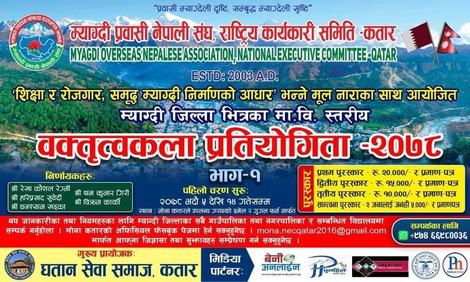 कतारमा रहेका प्रवासी म्याग्देलीहरुको साझा संस्था म्याग्दी प्रवासी नेपाली सङ्घ (मोना) कतारले जिल्लामा अन्तर मावि स्तरीय वक्तृत्वकला प्रतियोगिता आयोजना गर्ने भएको छ l कोरोनाका कारण अनलाइन माध्यमबाट प्रतियोगिता आयोजना गर्न लागिएको मोना कतारले जनाएको छ l