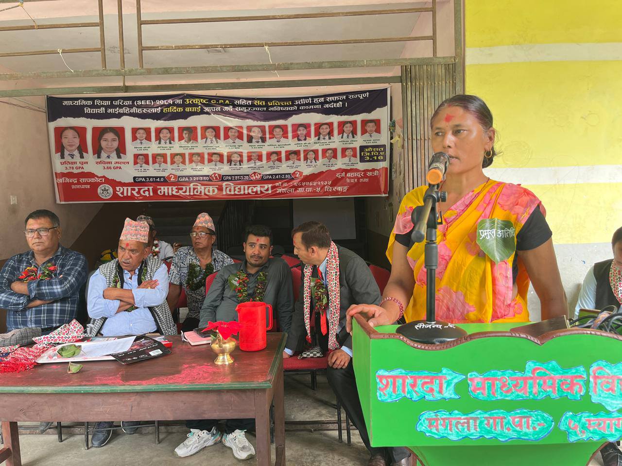 म्याग्दीको मंगला गाउँपालिका–५,छिस्बाङ्गस्थित शारदा माध्यमिक विद्यालयले एसईईमा उत्तीर्ण छात्रछात्रालाई स्थानीय समुदायले सम्मान गरेको छ । २५ जना विद्यार्थी सहभागि भएको परीक्षामा सतप्रतिशत नतिजा ल्याउन सफल भएको खुसीयालीमा विद्यार्थीलाई नगद सहित सम्मान गरिएको हो ।