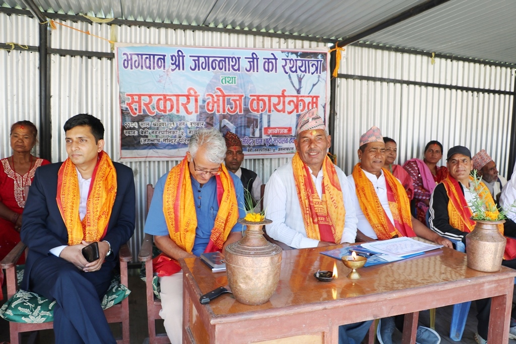 रथयात्रा तथा सरकारी भोज कार्यक्रमको उद्घाटन गर्दै बेनी नगरपालिकाका नगर प्रमुख सुरत केसीले जगन्नाथ क्षेत्रमा धार्मिक पर्यटनको प्रवद्र्धन गर्नका लागि बेनी नगरपालिकामार्फत आवश्यक पहल गरिएको बताउनुभयो । उहाँले बेनी नगरपालिकाले पुलहाश्रम, जगन्नाथ, ढोलठानलगायत क्षेत्रमा पुग्ने सडक स्तरोन्नतिमा जोड दिइएको बताउनुभयो ।