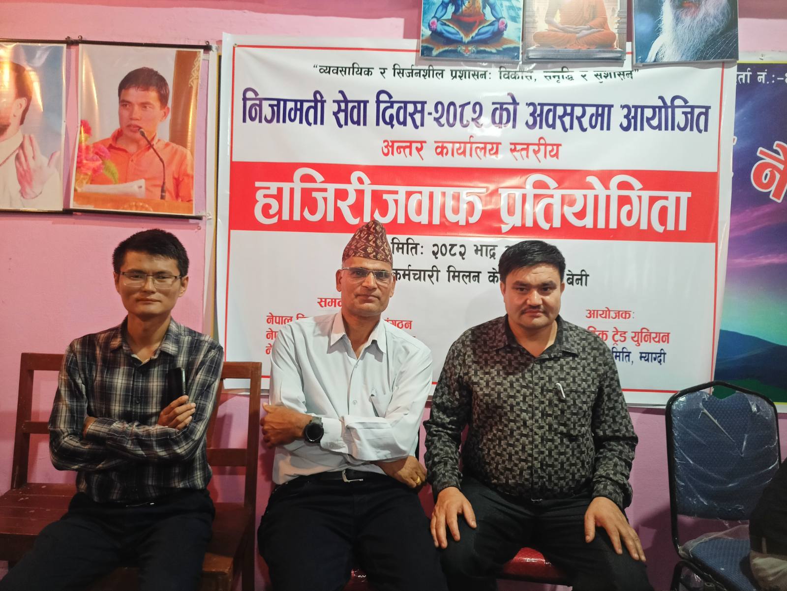 दिवसकै अवसरमा जनप्रतिनिधि र कर्मचारीबिच मैत्रीपूर्ण फुटबल प्रतियोगितामा बेनी नगरकार्यपालिका सदस्य कृष्णकुमार विश्वकर्माको समुह प्रथम र सामाजिक विकास कार्यालय प्रमुख तारानाथ शर्माको समुह उपविजेता भएको थियो , प्रथम र द्धितियलाई क्रमश ५ हजार, २५ सय नगद, प्रमाणपत्र वितरण गरिएको थियो । यता निजामति सेवा दिवसका अवसरमा आइतबार बिहान सदरमुकाम बेनीबजारमा प्रभातफेरीसमेत गरिएको थियो। कार्यक्रममा शुभकामना आदानप्रदान गर्नुका साथै विभिन्न प्रतियोगिताका विजेतालाई पुरस्कार तथा प्रमाणपत्र वितरण गरिएको थियो।