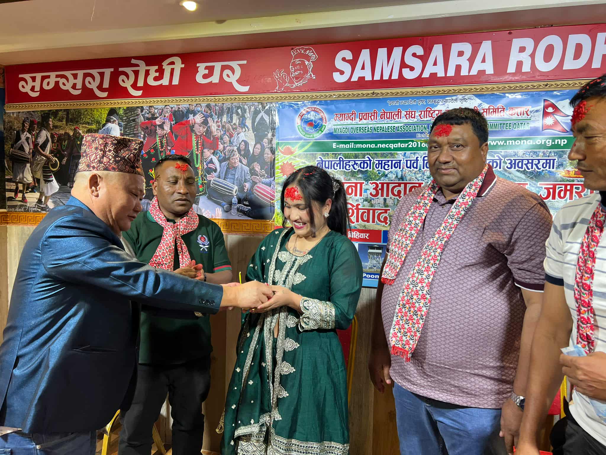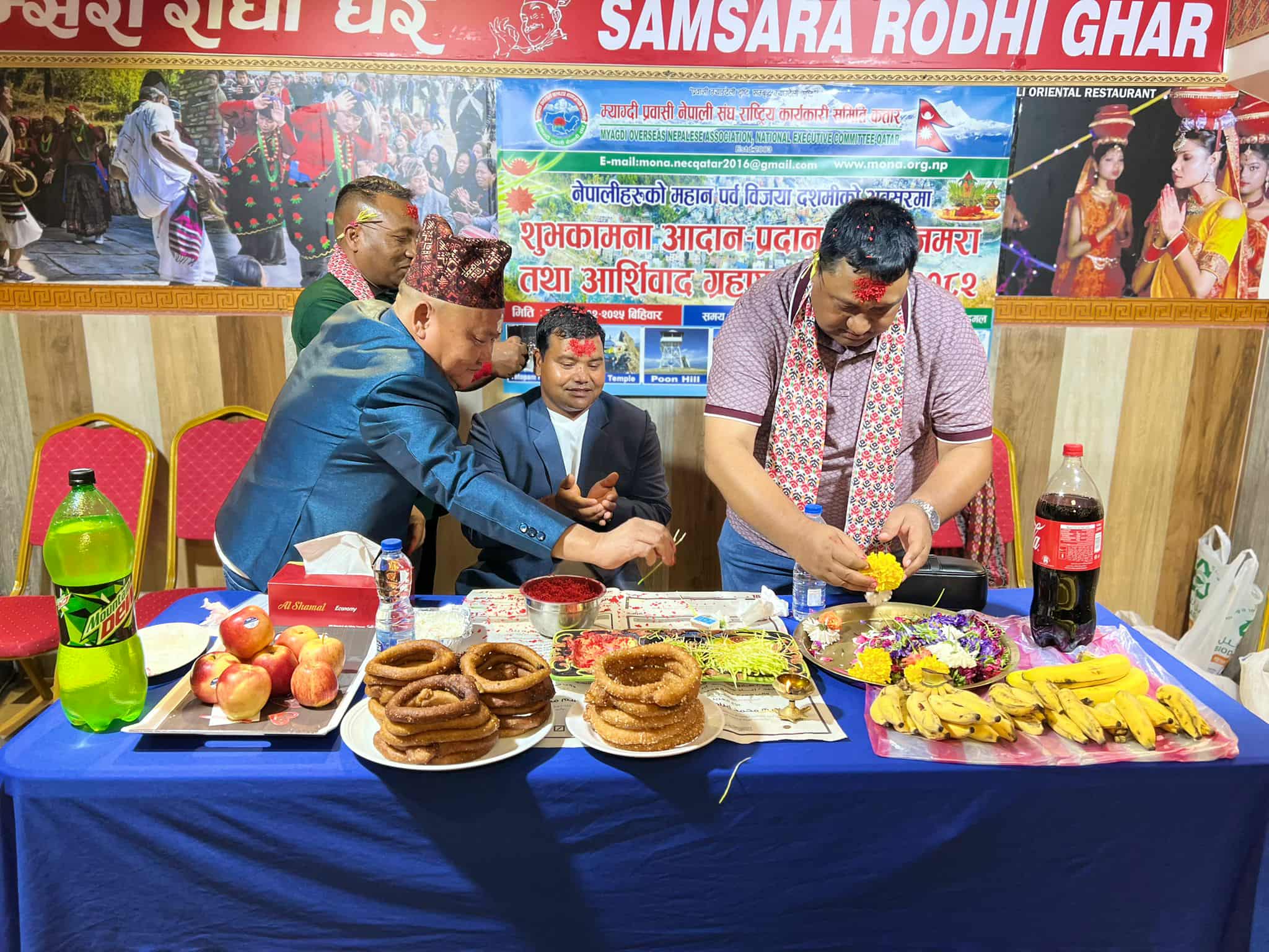 दशैैमा जन्मभूमीमा परिवारसँग मनाउन नपाएकालाई खल्लो हुन नदिन शुभकामना आदानप्रदान सहित टिका लगाइएको मोना कतारका कार्यबाहक अध्यक्ष देवी कँडेलले जानकारी दिनुभयो ।