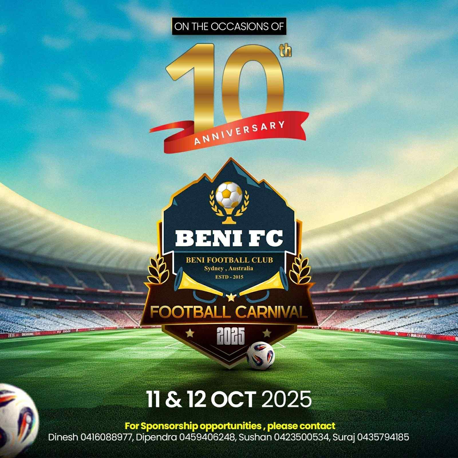 अष्ट्रेलियाको सिड्नीमा रहेको प्रतिष्ठित फुटबल क्लब बेनी एफसीले स्थापनाको १० बर्ष पुगेको उपलक्ष्यमा एन एस डब्लुकै सर्वाधिक धनराशीको फुटबल प्रतियोगिताको आयोजना गरेको छ ।