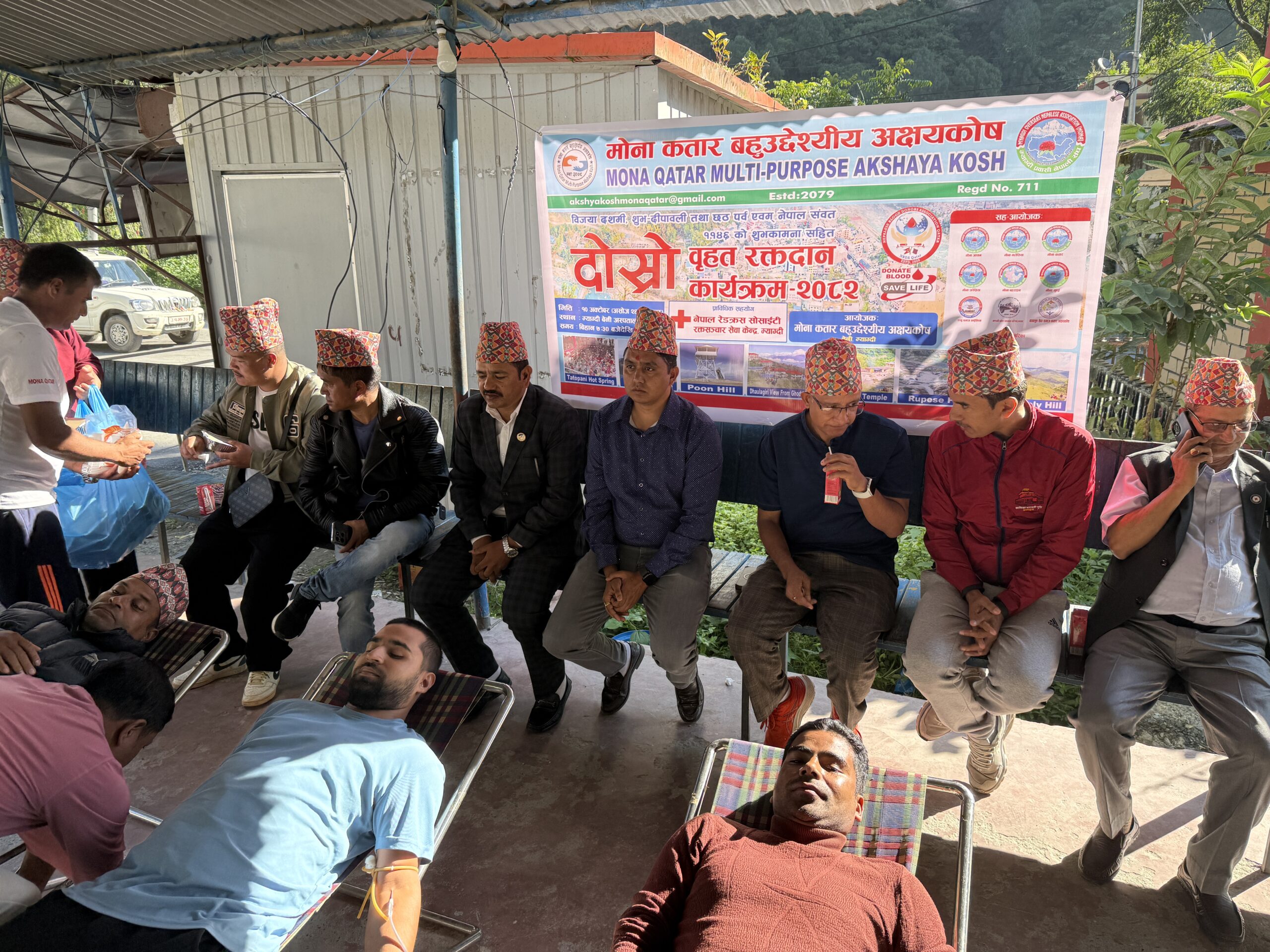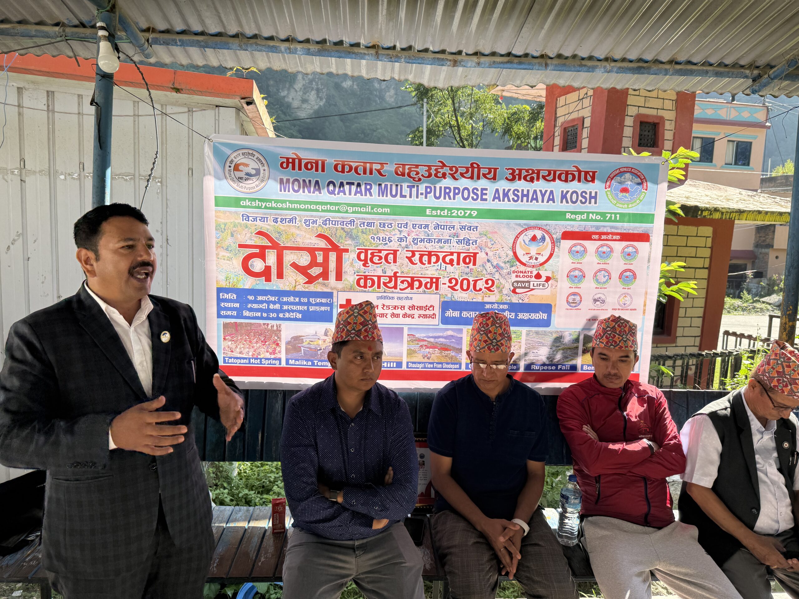 रक्तदान कार्यक्रममा बागलुङ नगरपालिकाका उपमेयर राजु खड्का, मोना अन्तराष्ट्रि«यका कोषाध्यक्ष नरेन्द्र फगामी र नेपाल पत्रकार महासंघ म्याग्दीका अध्यक्ष हरिकृष्ण गौतमले मन्तब्य राख्नुभएको थियो । रक्तदान कार्यक्रममा विभिन्न देशमा रहेका मोनाका राष्ट्रिय कार्यकारी समितिले सहयोग गरेका थिए । कोषका अध्यक्ष बिक्रम कार्कीले १ करोडको अक्षय कोष स्थापना गरी कतारबाट फर्किएका म्याग्देली तथा जिल्लाका विभिन्न क्षेत्रमा सहयोग गर्ने बताउनुभयो ।
