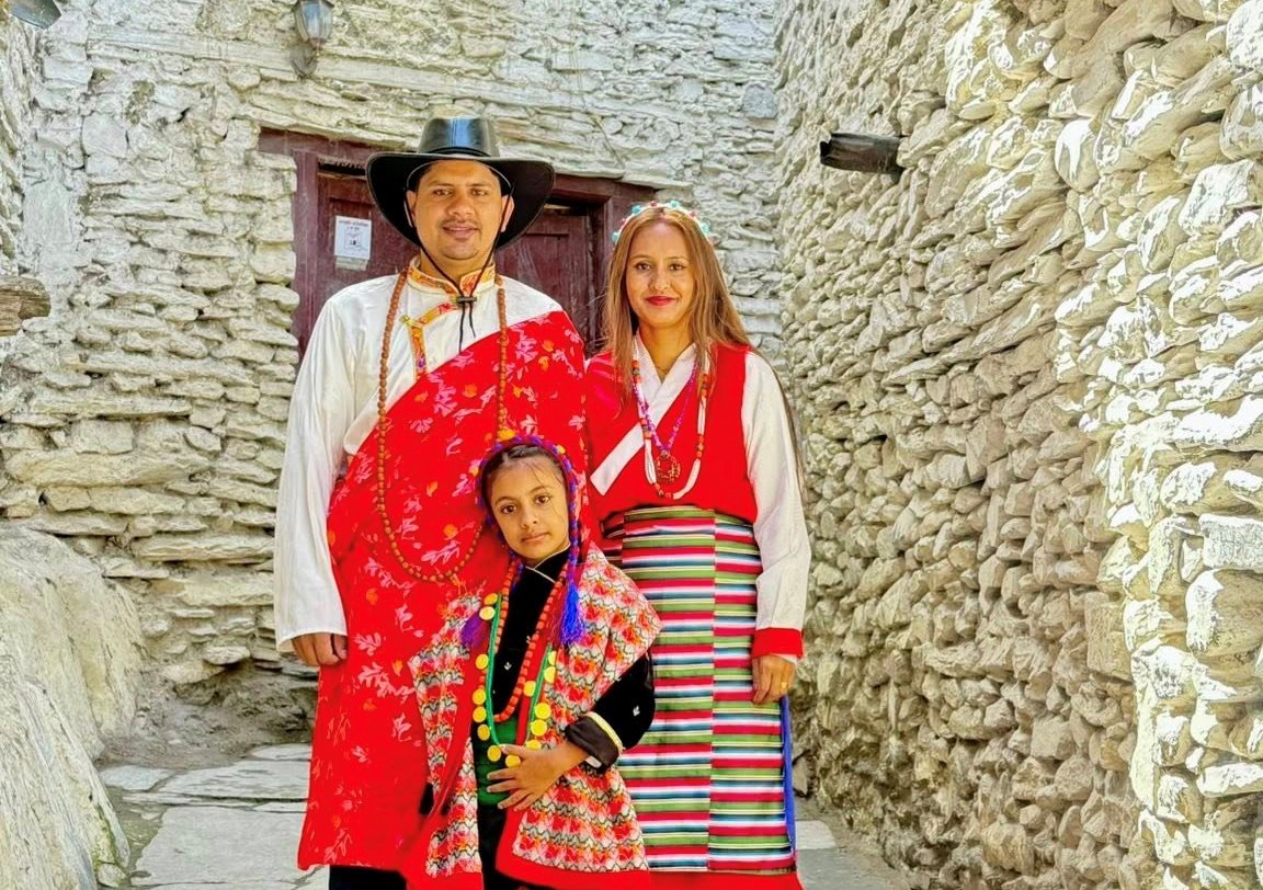 मुस्ताङको घरपझोङ गाउँपालिका–२ मा रहेको मार्फा गाउँमा हिमाली भेगको पोसाक बख्खु लगाएर तस्वीर खिचाउँदै । यहाँ पोशाक भाडामा दिएर समेत स्थानीयले मनग्य कमाउँछन् ।