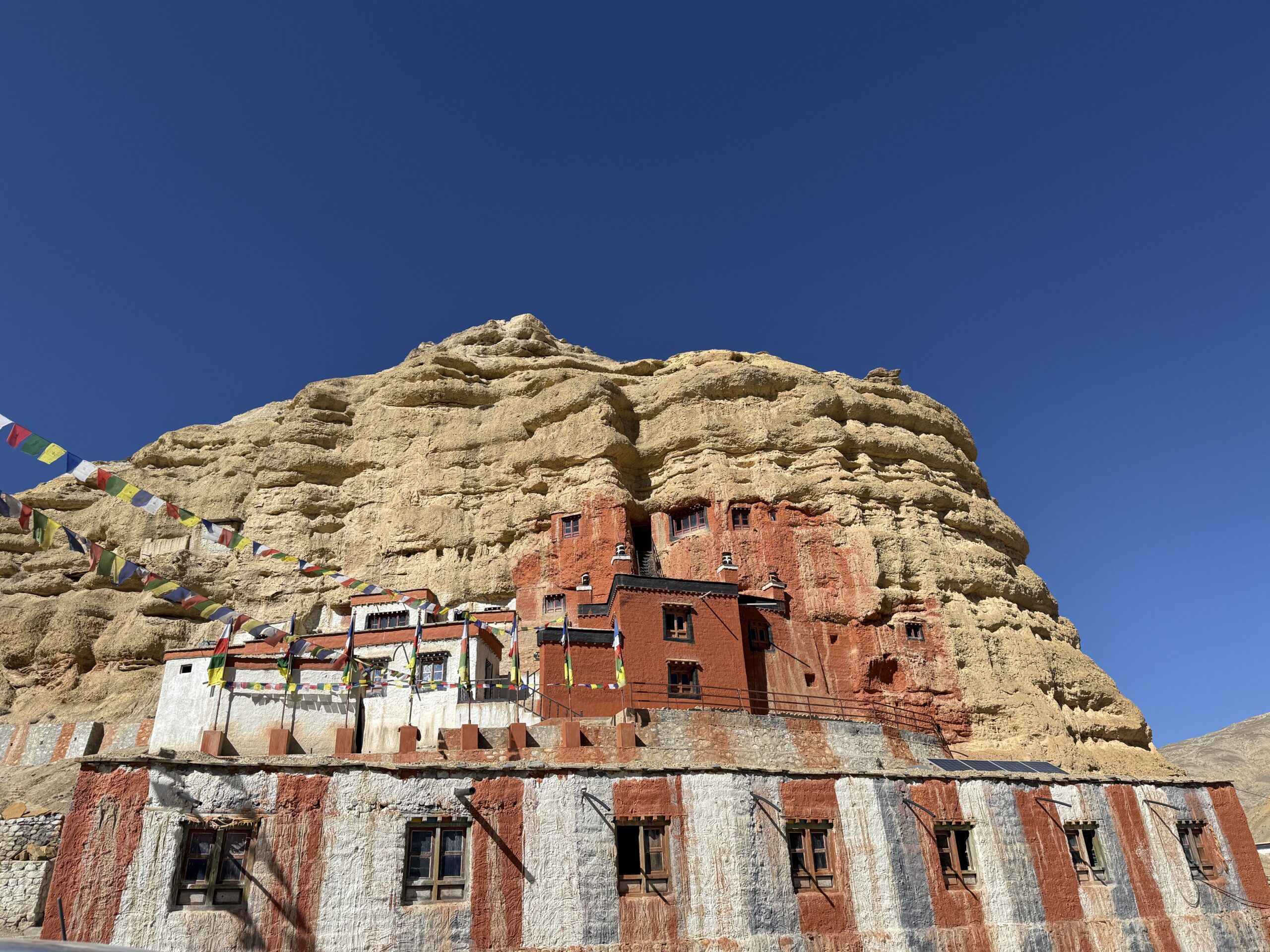 कलात्मक सिन्दुरे रङका चट्टान र रातो बलौटे पहाडमा १५ औ शताब्दीमा निर्मित पहाडभित्रको गुम्बा र तलगरी लामा शिक्षाका लागि १५ वटा कोठा रहेका छन् । समुन्द्री सतहदेखि करिब ३ हजार ८ सय ९० मिटरको उचाईमा पहाडभित्र रहेको गुम्बासँगै तल नयाँ गुम्बा समेत बनाइएको छ ।