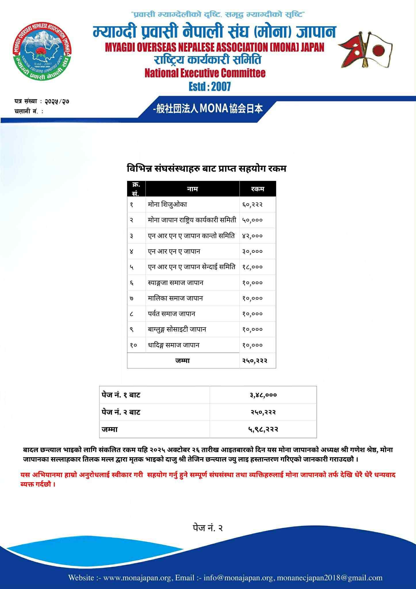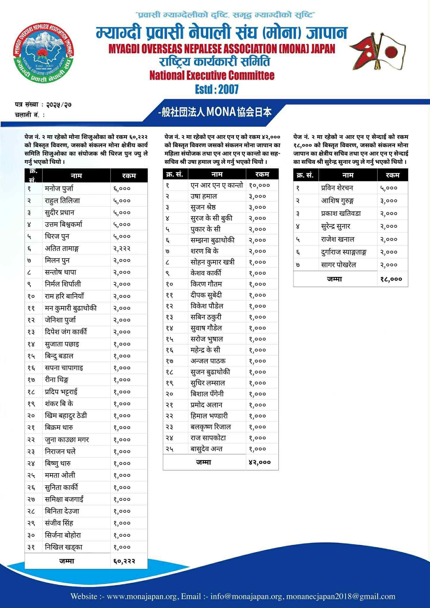 जापानको चिवा प्रान्त फुनाबासी शहरमा बस्ने म्याग्दी जिल्ला धवलागिरी गाउपालिका-५,स्थायी घर भई पोखराको हेम्जामा बस्ने छन्त्यालको गएको अक्टोबर ५ तारिकमा भएको घटना लगत्तै मोना जापानको पहलमा सञ्चालिन आर्थिक संकलन अभियानबाट ५ लाख ९८ हजार २२२ रुपैयाँ मृतकका दाजु तेजिन छन्त्याललाई हस्तान्तरण गरिएको मोना जापानका अध्यक्ष गणेश श्रेष्ठले बताउनुभयो ।