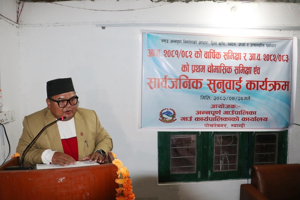 ‘समृद्ध अन्नपूर्ण निर्माणको आधार ः दीगो कृषि, पर्यटन, ऊर्जा र उत्थानशील पूर्वाधार’ भन्ने मूल नारासहित गतवर्ष र चालु आवको चौमासिक अवधिसम्म सञ्चालित कार्यक्रम, सम्पन्न योजनाहरु र भए गरेका कामको बारेमा गाउँपालिका अन्तर्गत विभिन्न शाखाहरुबाट प्रस्तुतीकरण गरिएको थियो । शाखाको गतिविधिहरु प्रस्तुतीपछि गाउँपालिका र सहभागीहरुको बीचमा सवाल–जवाफसहित सार्वजनिक सुनुवाइ भएको हो ।
