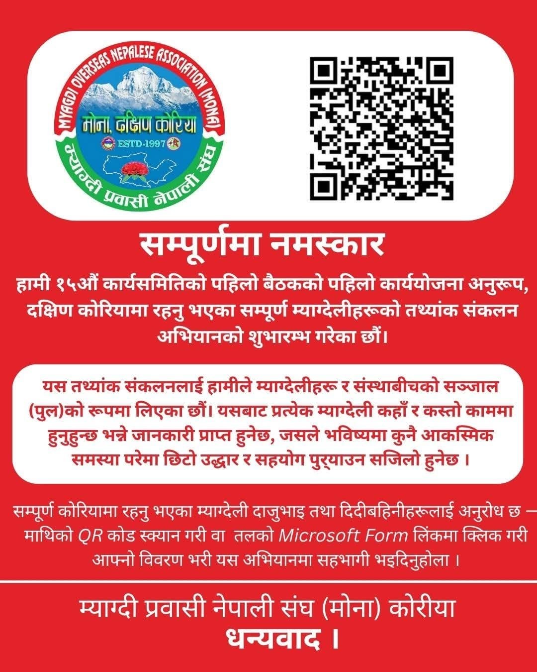 म्याग्दी प्रवासी नेपाली संघ मोना दक्षिण कोरियाले म्याग्देलीको तथ्याङ्क संकलनलाई तिब्रता दिएको छ । रोजगार, ब्यवसाय र शिक्षाको सिलसिलमा दक्षिण कोरियामा आएका म्याग्देली बिचको एकता तथा सहकार्य तथा कुनै समस्या परेमा तत्काल उद्धार तथा सहयोगमा समेत ‘सहज हुने गरी विवरण संकलन सुरु गरिएको हो ।