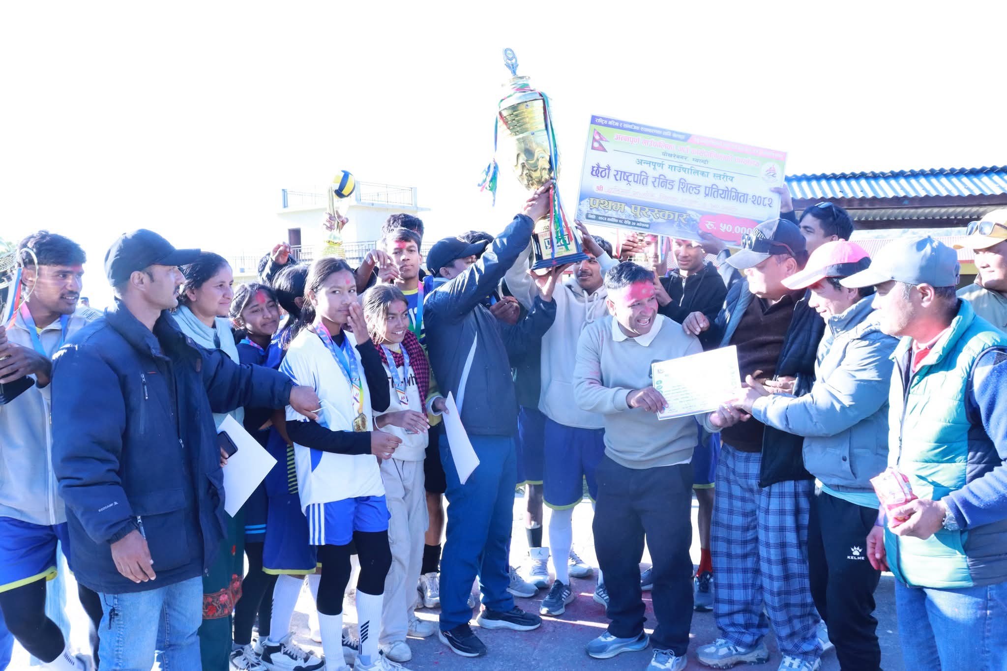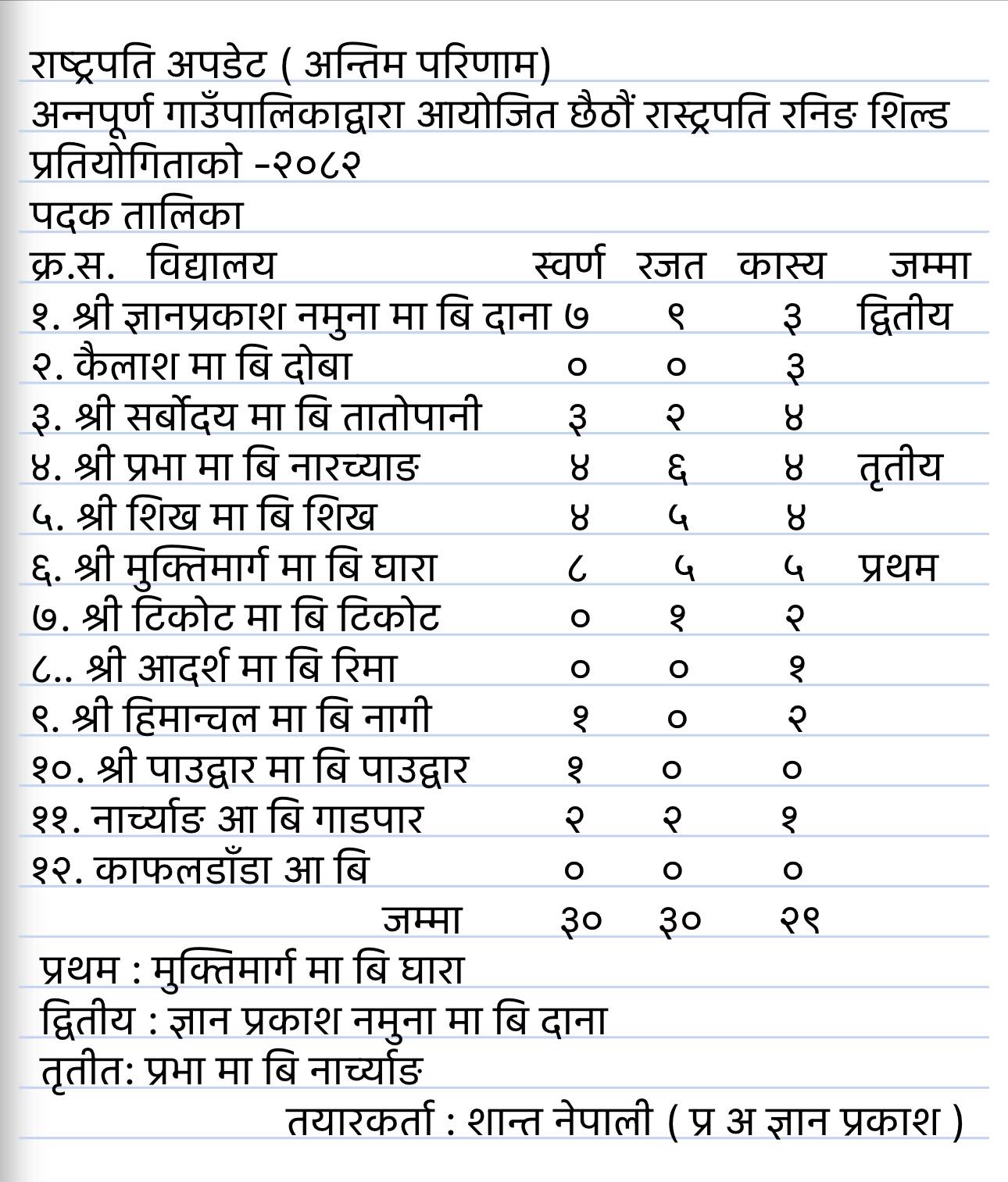 अन्नपूर्ण गाउँपालिका–८ नांगीमा आइतबार सम्पन्न अन्तर विद्यालयस्तरीय छैटौँ राष्ट्रपति रनिङ शिल्ड प्रतियोगिता वडा नं ६ घारस्थित मुक्तिमार्ग माविले आफ्नो पोल्टामा पारेको छ । आठ स्वर्ण, पाँच रजत र पाँच कास्य पदक सहित गत वर्षको उपबिजेता मुक्तिमार्ग पालिका स्तरीय राष्ट्रपति रनिङ्ग शिल्डको बिजेता बनेको हो । सात स्वर्ण, नौ रजत र तीन कास्य पदक जितेको ज्ञानप्रकाश मावि दृतीय र चार स्वर्ण, छ रजत र चार काश्य पदक जितेको प्रभा मा.वि. तृतीय भएको अन्नपूर्ण गाउँपालिकाको सहायक शिक्षा अधिकृत मेखबहादुर घर्ती क्षेत्रीले बताउनुभयो ।