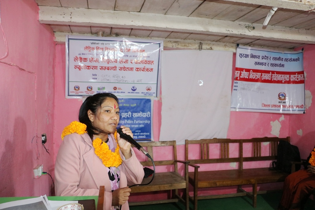 कार्यक्रममा सहजीकरणसहित सम्बोधन गर्दै म्याग्दीका प्रमुख जिल्ला अधिकारी बद्रीप्रसाद तिवारीले बालविवाह सामाजिक अपराधको रुपमा रहेकाले २० वर्ष उमेर पूरा नभई विवाह गराइदिनलाई समेत कानुन अनुसार कारवाही हुने बताउनुभयो । उहाँले २० वर्षको उमेर पूरा नगरी विवाह गरेमा महिलाको स्वास्थ्यमा समेत गम्भीर असर पर्ने भएकाले कानुनले तोकेको मापदण्ड अनुसार विवाह गर्न र गराउन सहभागीलाई सुझाव दिनुभयो ।