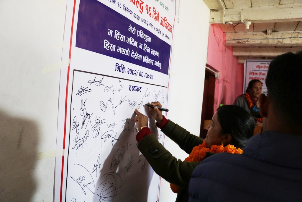 १६ दिने अभियानको महत्व बुझाउन, समुदायस्तरबाटै लैङ्गिक हिंसाको अन्त्य गर्न तथा अवैध लागूऔषधको ओसारपोसारलाई नियन्त्रण र ग्रामीण क्षेत्रमा सचेतना फैलाउने उद्देश्यले कार्यक्रमहरु गरिएका हुन् । जिल्ला समन्वय समिति म्याग्दीका कार्यवाहक प्रमुख डिलकुमारी खत्रीले ‘म हिंसा गर्दिन, म हिंसा सहन्न र हिंसा भएको देखेमा प्रतिकार गर्नेछु’ भन्ने प्रतिबद्धता लेखिएको व्यानरमा हस्ताक्षर गरी कार्यक्रमको उद्घाटन गर्नुभयो ।