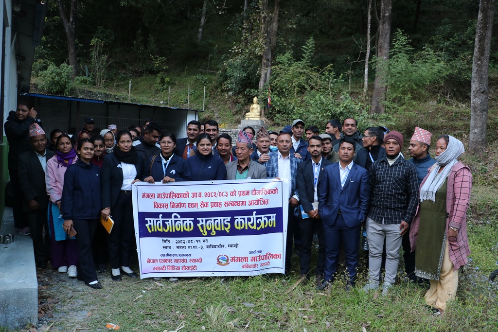 मंगला गाउँपालिका म्याग्दीको आयोजना, नेपाल पत्रकार महासंघ जिल्ला शाखा म्याग्दी र म्याग्दी मिडिया सोसाइटीको सहजीकरण तथा समन्वयमा सार्वजनिक सुनुवाइ सम्पन्न भएको छ । मंगला गाउँपालिकाको चालु आर्थिक वर्ष २०८२÷०८३ को प्रथम चौमासिकमा सम्पन्न विकास निर्माण एवं सेवा प्रवाहको सम्बन्धमा बिहीबार सार्वजनिक सुनुवाइ गरिएको हो ।