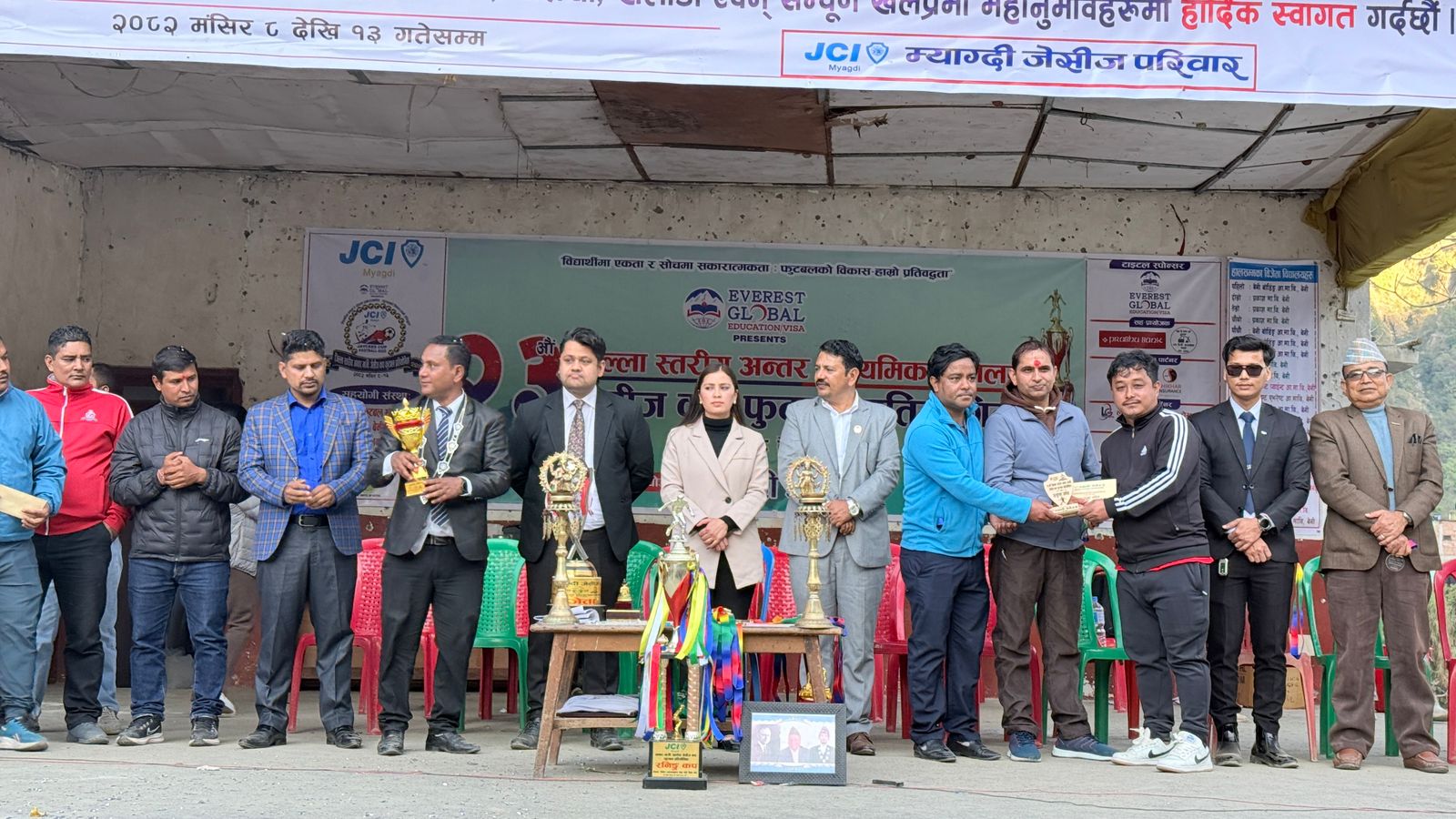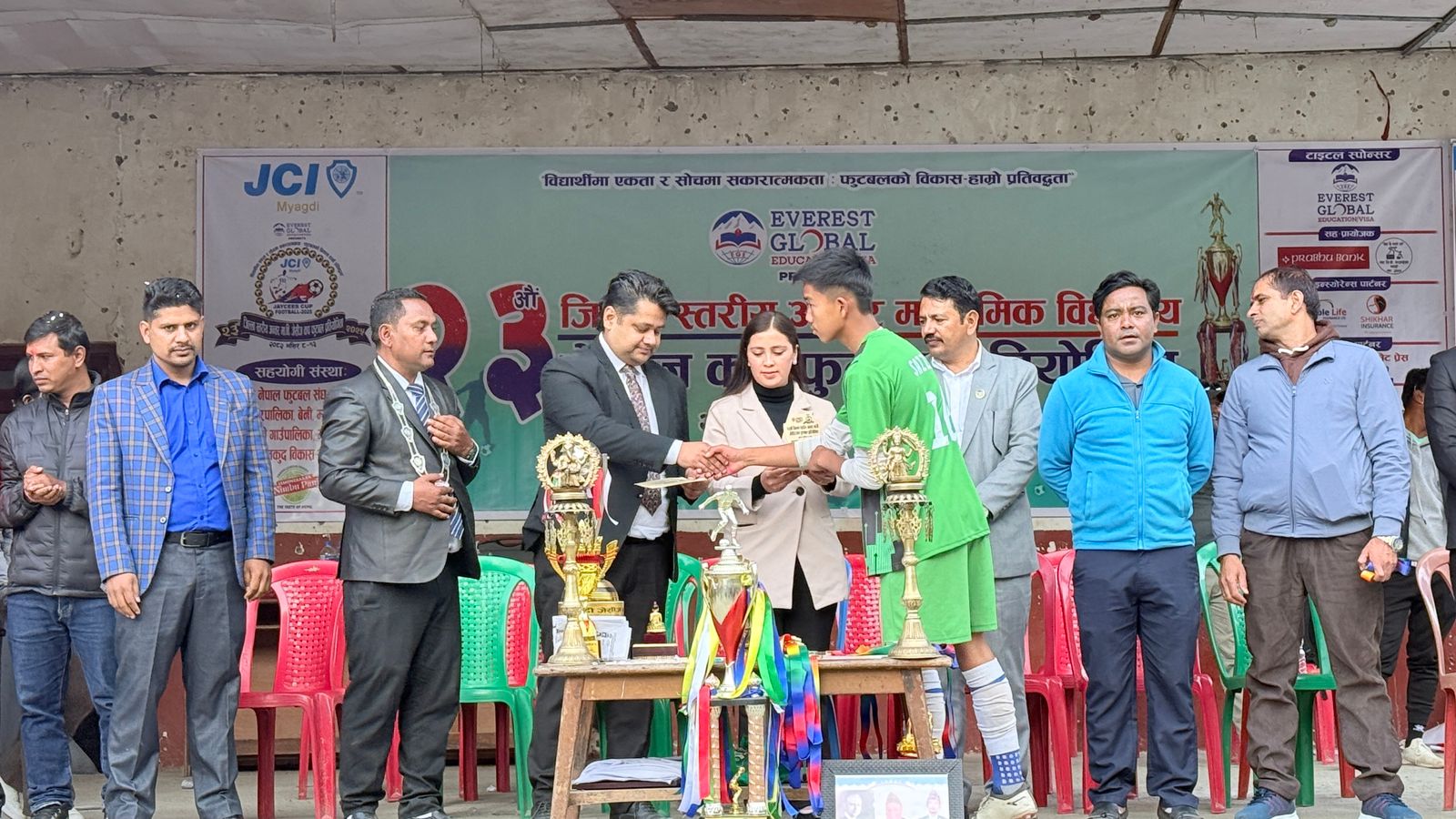 प्रतियोगितामा बिजेता विद्यालयलाई गण्डकी प्रदेशसभाका सदस्य हरि भण्डारी, बेनी नगरपालिकाका कार्यपालिका सदस्य कृष्णकुमार विश्वकर्मा, नेपाल जेसीजका राष्ट्रिय उपाध्यक्ष अनुप दुलाल, उपाध्यक्ष सन्दिर खत्री, बागलुङ जेसीजका शाखा अध्यक्ष सुशान्तकृष्ण श्रेष्ठ, म्याग्दी जेसीजका अध्यक्ष बिनोद घर्ती क्षेत्री,मुख्य प्रायोजक एभरेष्ट ग्लोबल एजुकेशन भिसा सर्भिसेस बेनीकी प्रमुख अस्मिता केसी बानियाँले रनिङ शिल्ड, ट्रफि, मेडल र प्रमाणपत्र सहित नगद ५५ हजार पाँच सय ५५ र उपबिजेताले ट्रफि, मेडल र प्रमाणपत्र सहित नगद ३५ हजार पाँच सय ३५ पुरस्कार वितरण गरेका थिए ।