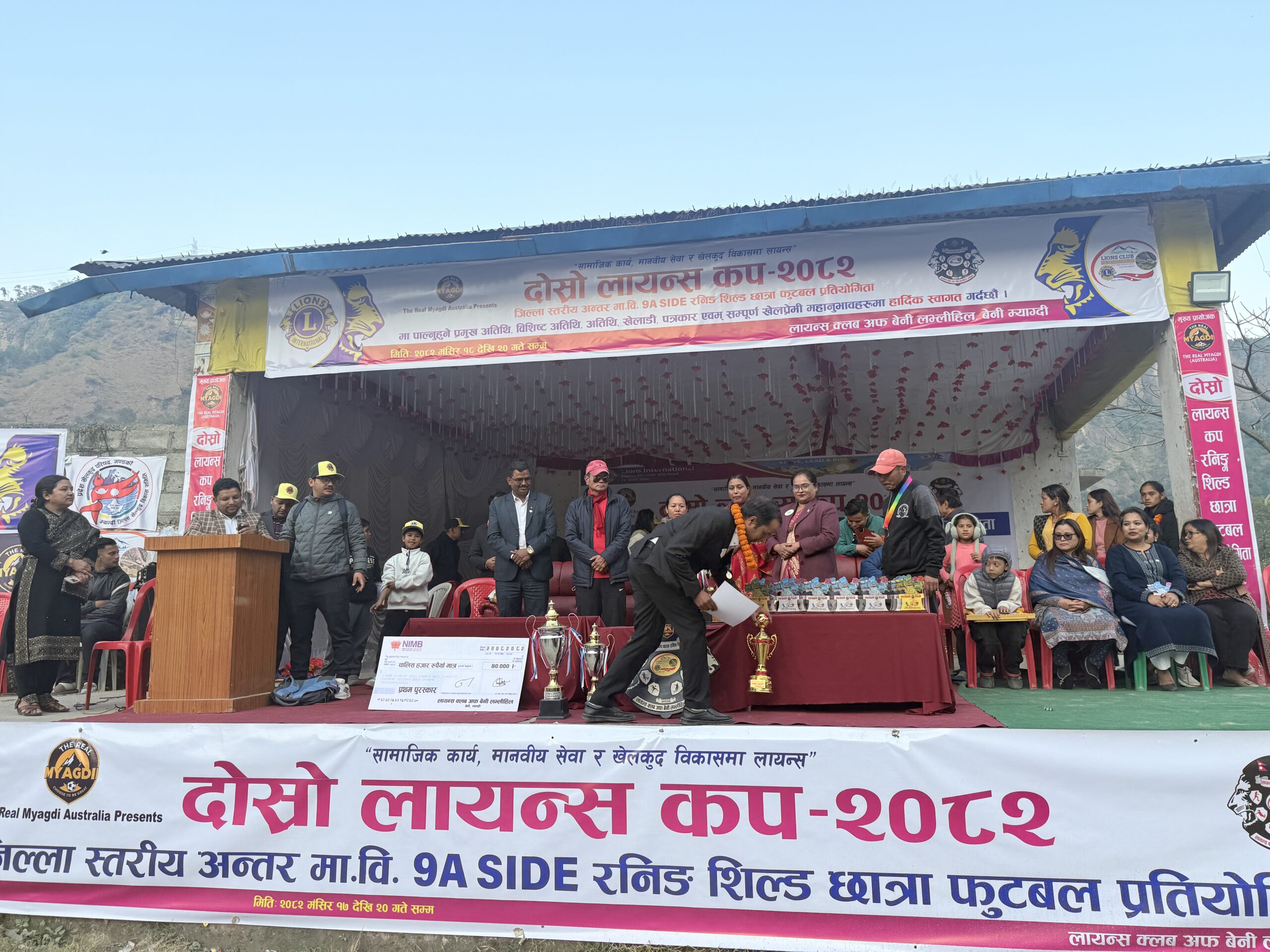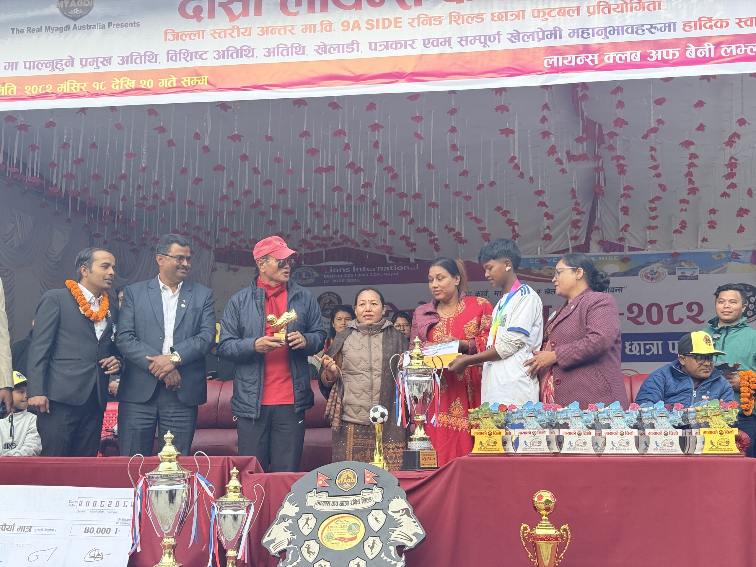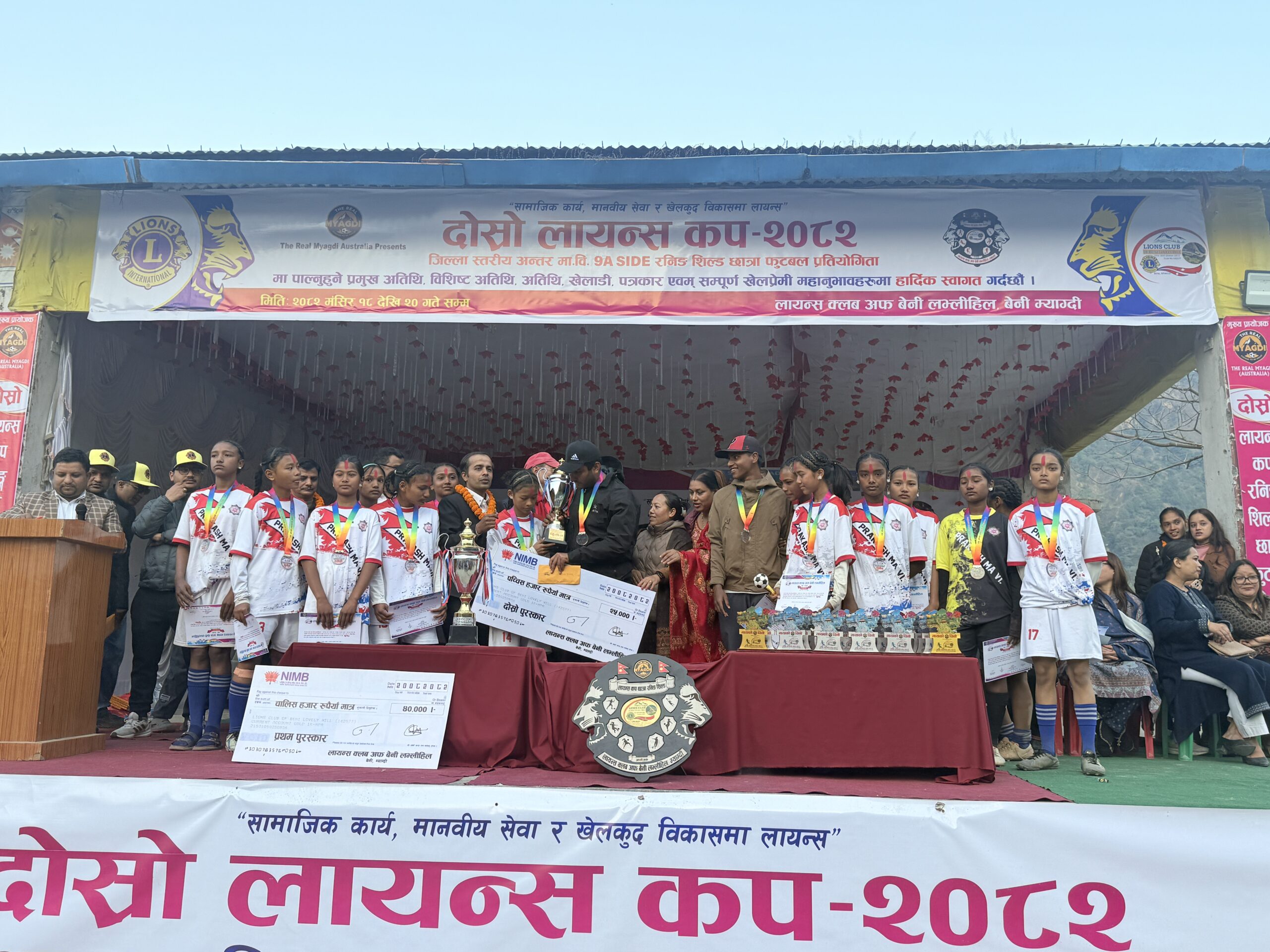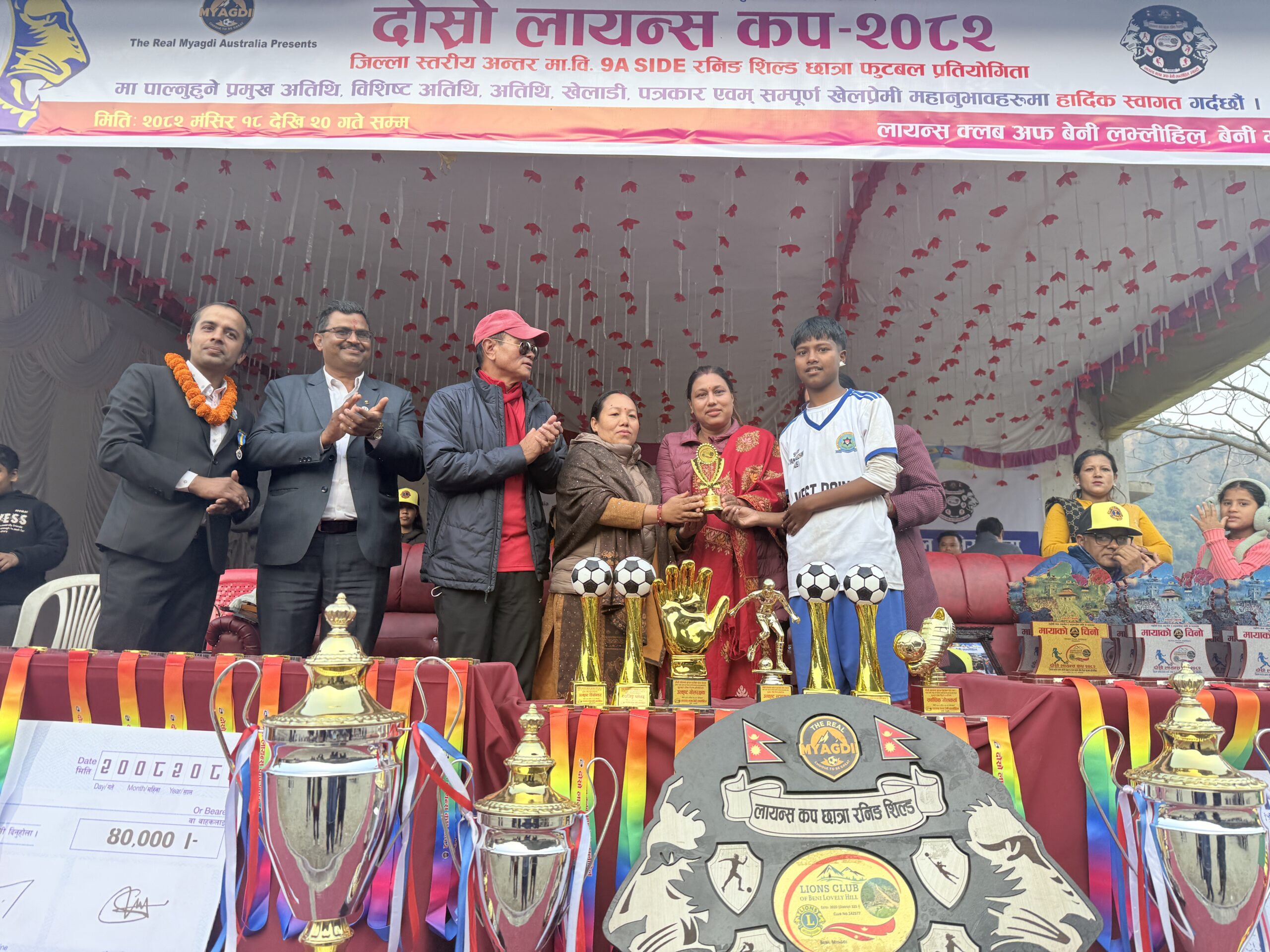 लायन्स क्लब अफ बेनी लभ्लीहिलको आयोजनामा खुल्ला मञ्चमा सम्पन्न दोस्रो लायन्स अन्तर माध्यमिक विद्यालय स्तरीय छात्रा फुटबलको उपाधि न्यू वेष्ट पोइन्ट आवासीय मावि बेनीले जितेको छ। शनिबार सम्पन्न भएको खुल्ला मञ्च बेनीमा सम्पन्न भएको फाइनलमा न्यू वेष्ट पोइन्टले प्रकाश माविलाई १–० ले पराजित गदैं च्याम्पियन बनेको हो ।