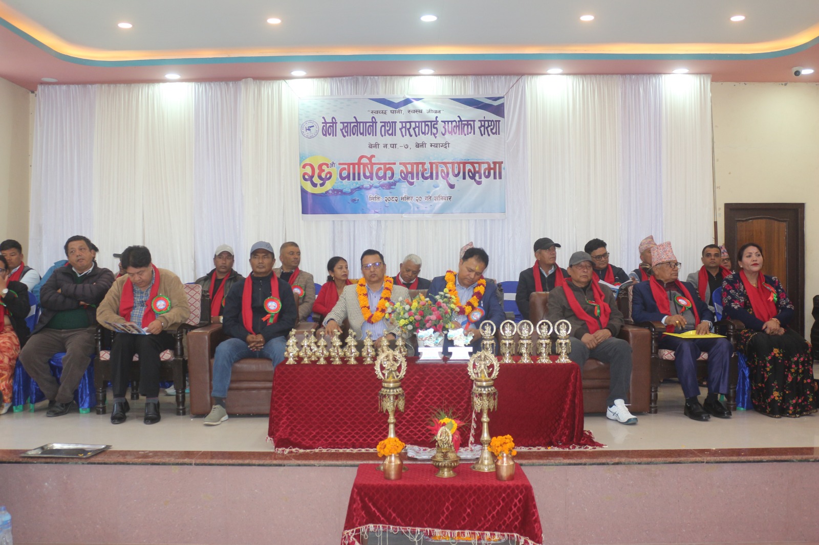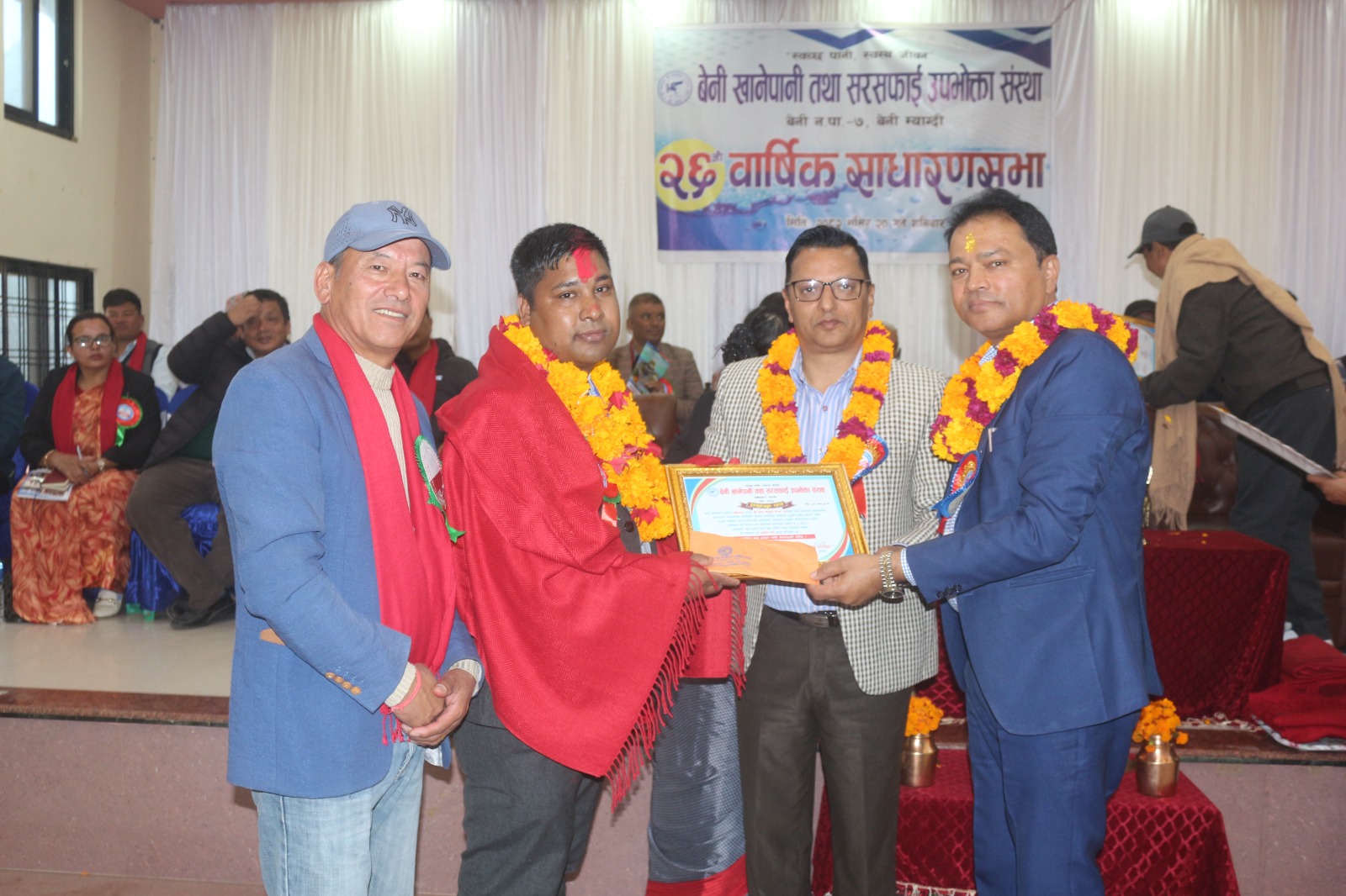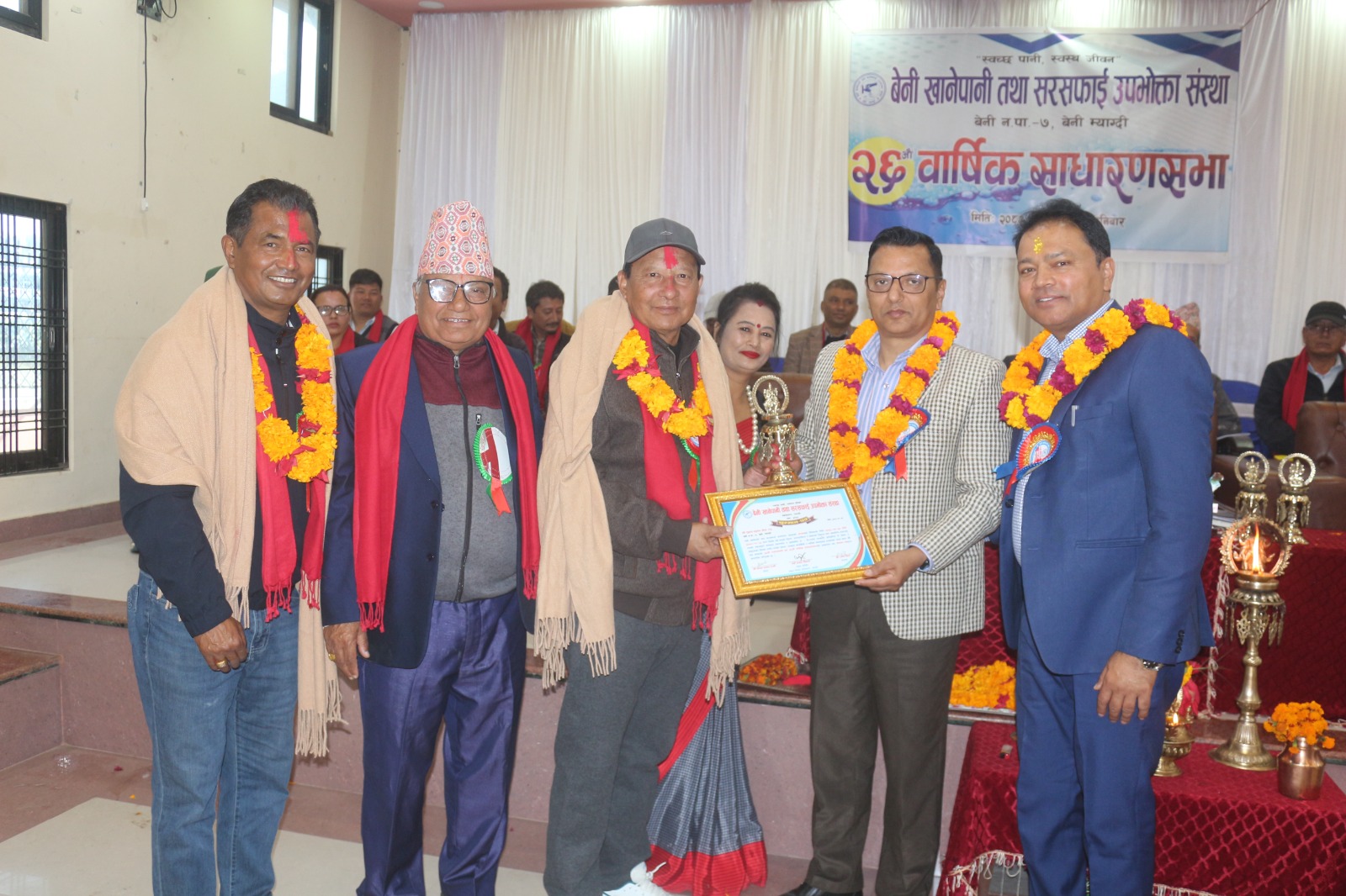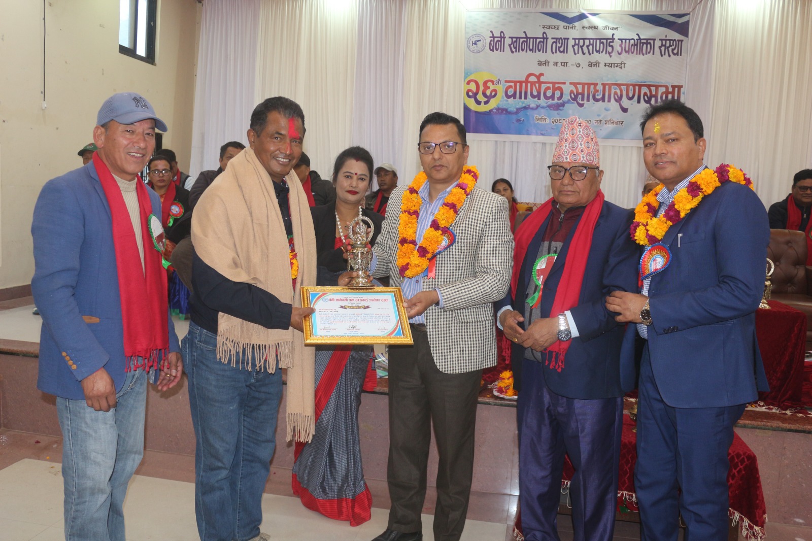 म्याग्दी सदरमुकाम बेनी स्थित बेनी खानेपानी तथा सरसफाई उपभोक्ता संस्थाको २६ औं वार्षिक साधारणसभा सम्पन्न भएको छ । संस्थाको बेनीमा शनिबार सम्पन्न साधारणसभामाको अवसरमा विभिन्न व्यक्ती ,संस्था र कर्मचारीलाई सम्मान सँगै गलेश्वरधाम ज्येष्ठ नागरिक आश्रमलाई आर्थिक सहयोग गरिएको छ ।