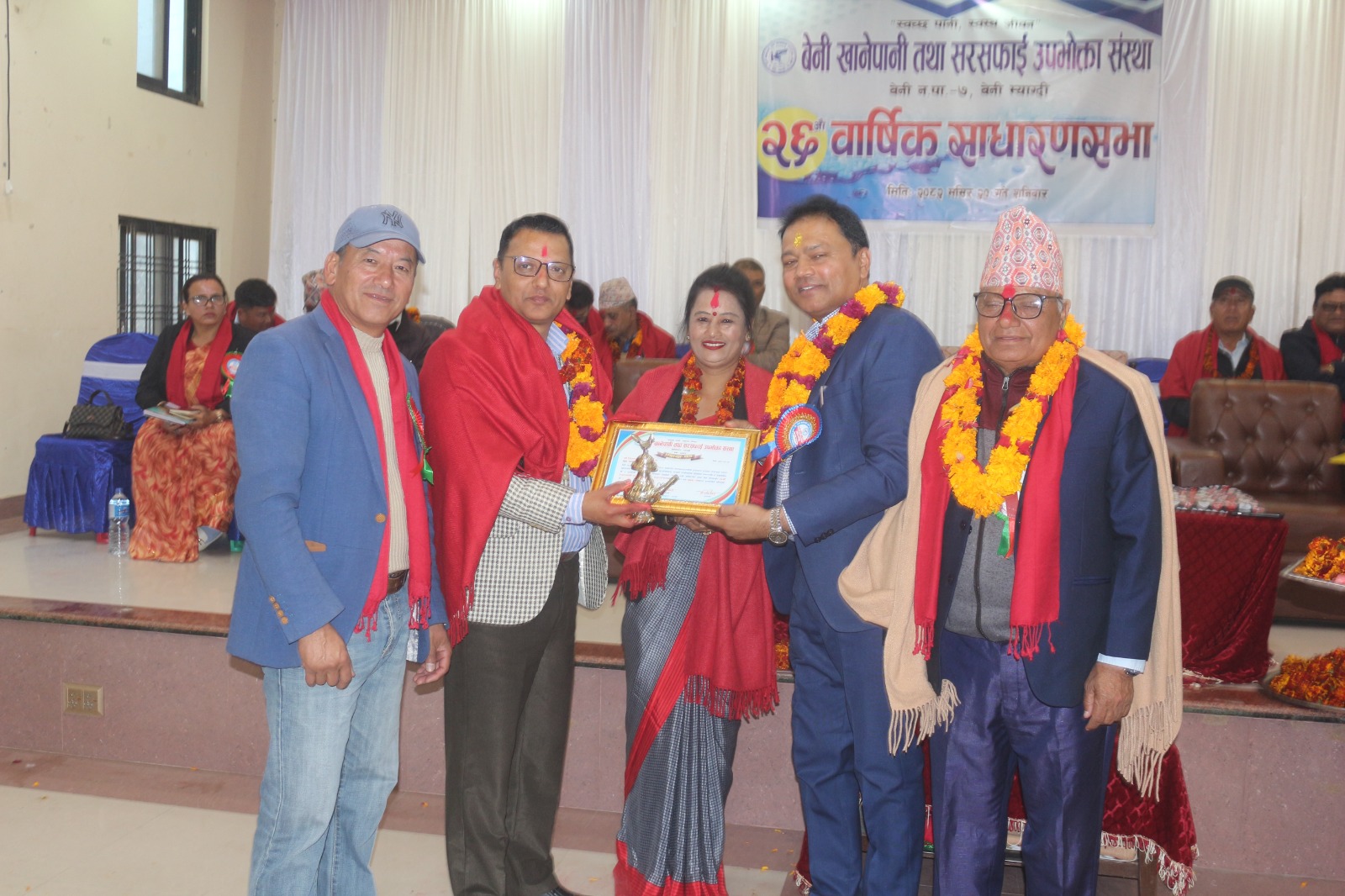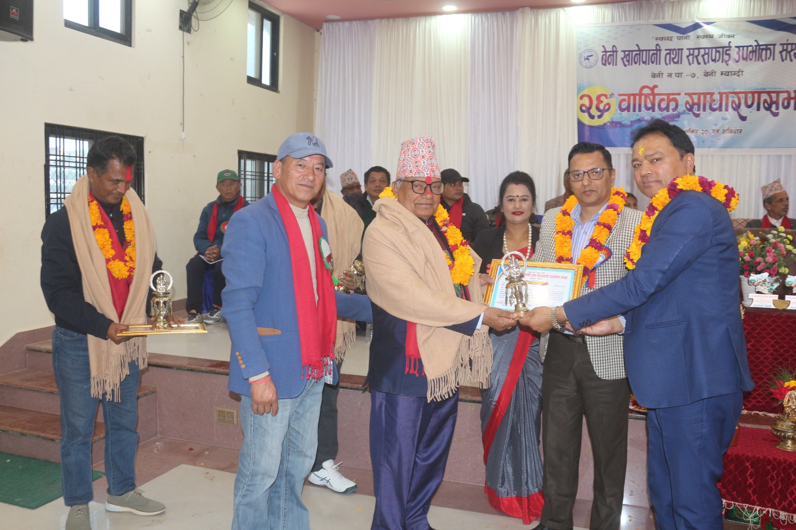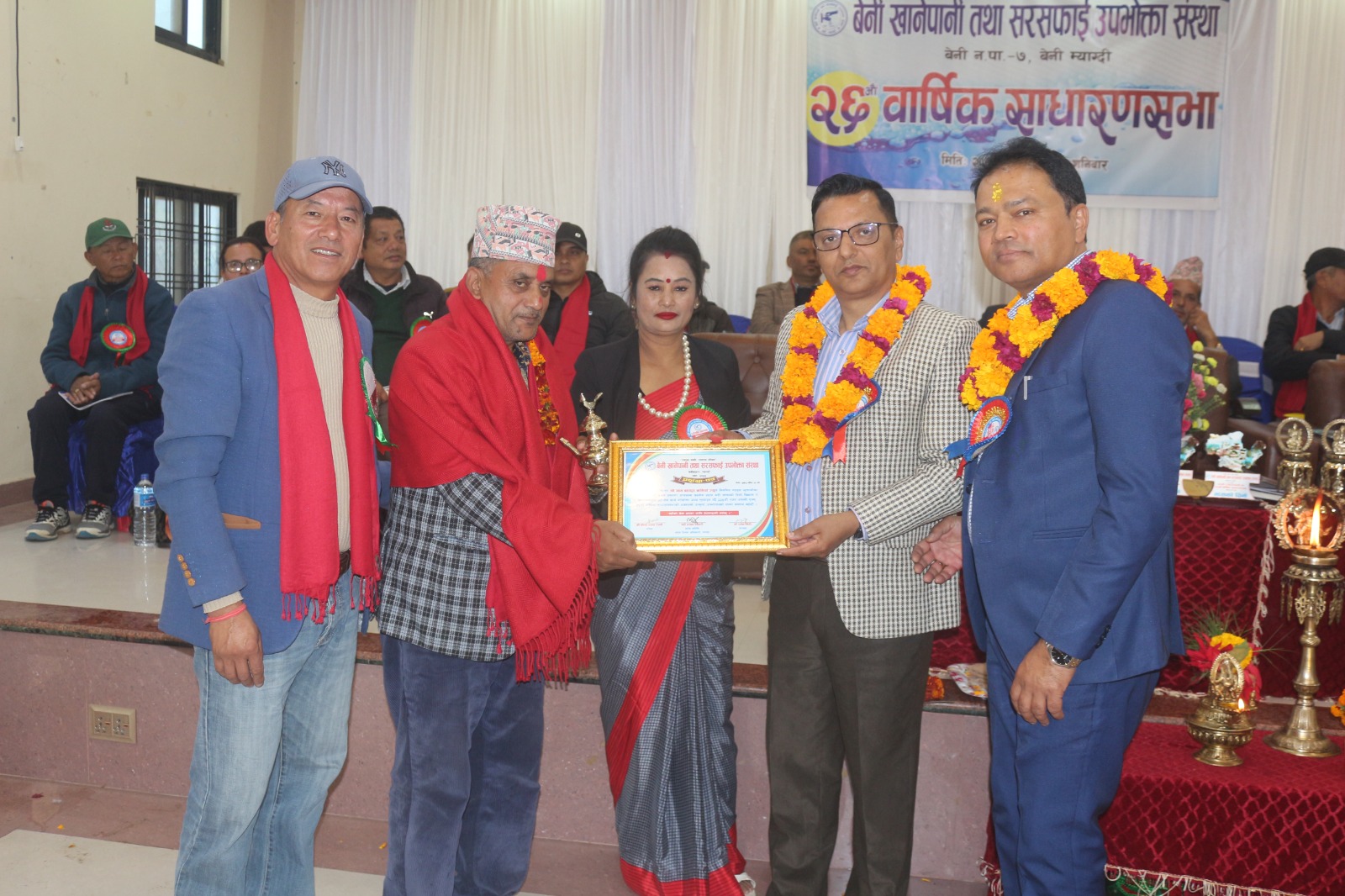 म्याग्दी सदरमुकाम बेनी स्थित बेनी खानेपानी तथा सरसफाई उपभोक्ता संस्थाको २६ औं वार्षिक साधारणसभा सम्पन्न भएको छ । संस्थाको बेनीमा शनिबार सम्पन्न साधारणसभामाको अवसरमा विभिन्न व्यक्ती ,संस्था र कर्मचारीलाई सम्मान सँगै गलेश्वरधाम ज्येष्ठ नागरिक आश्रमलाई आर्थिक सहयोग गरिएको छ ।