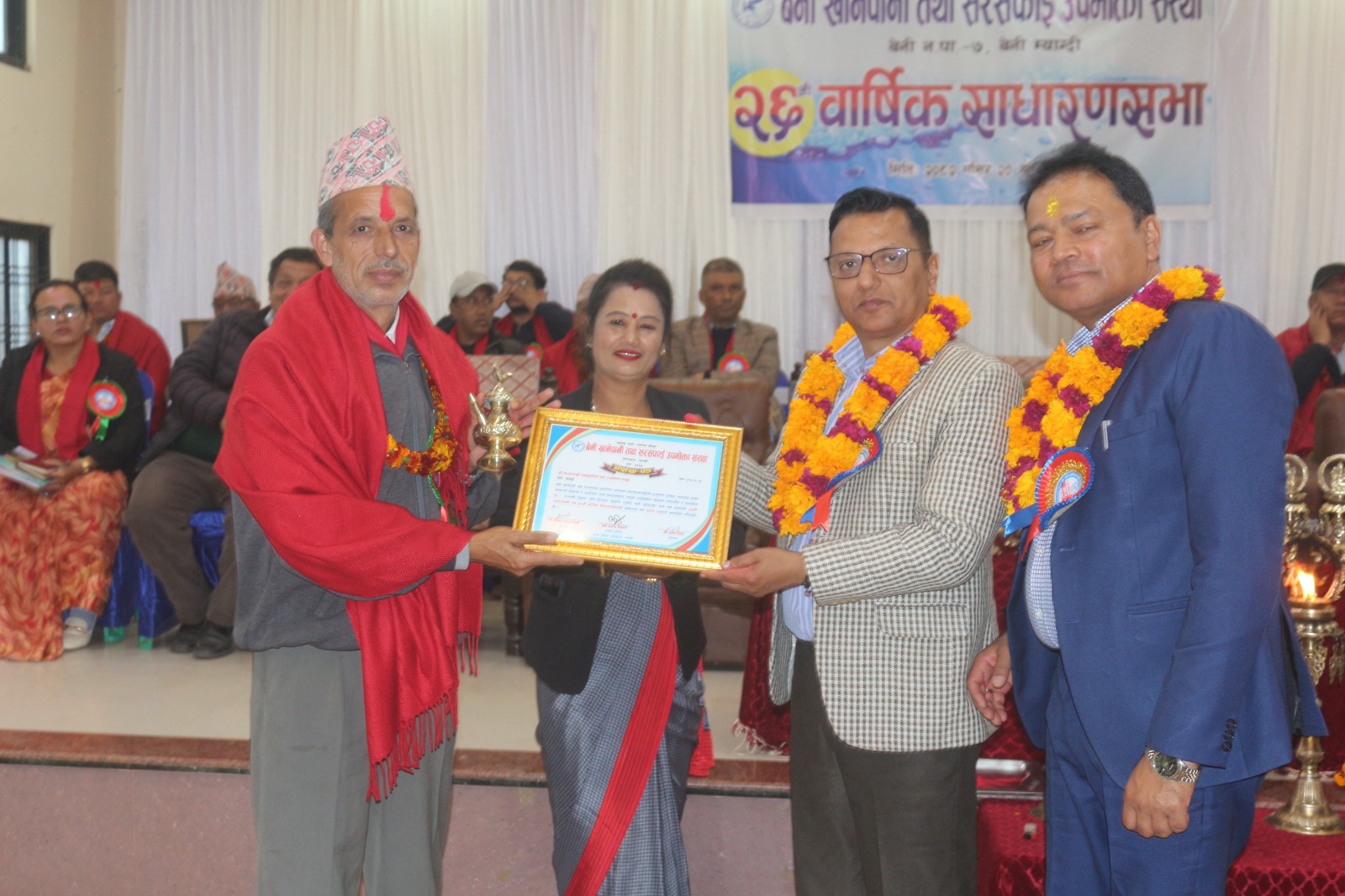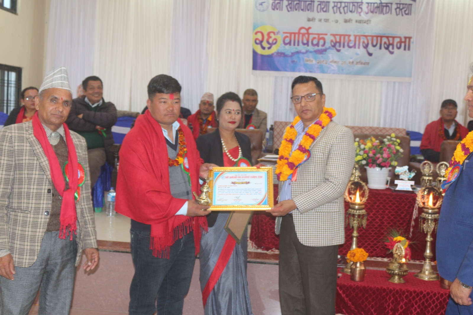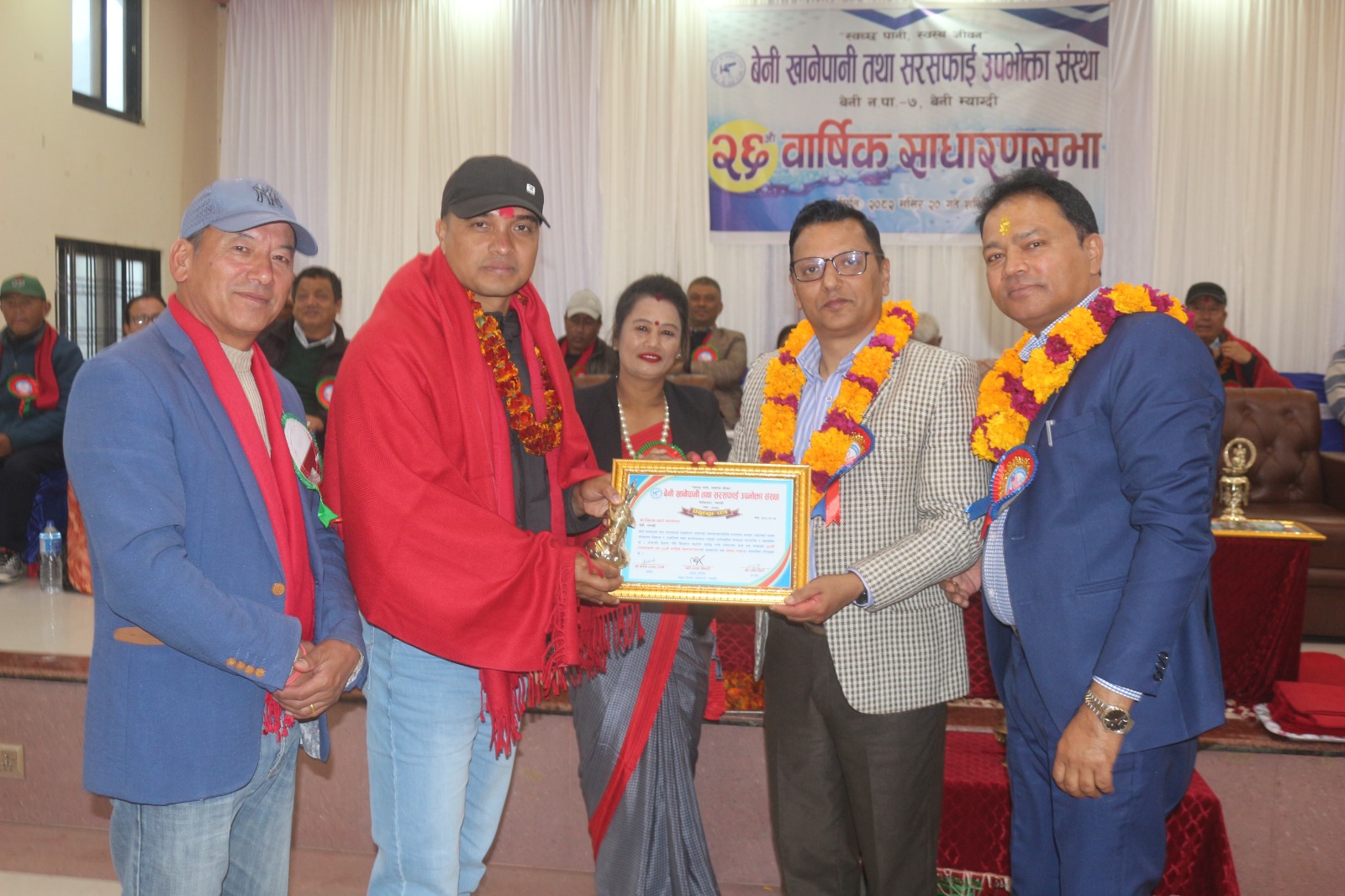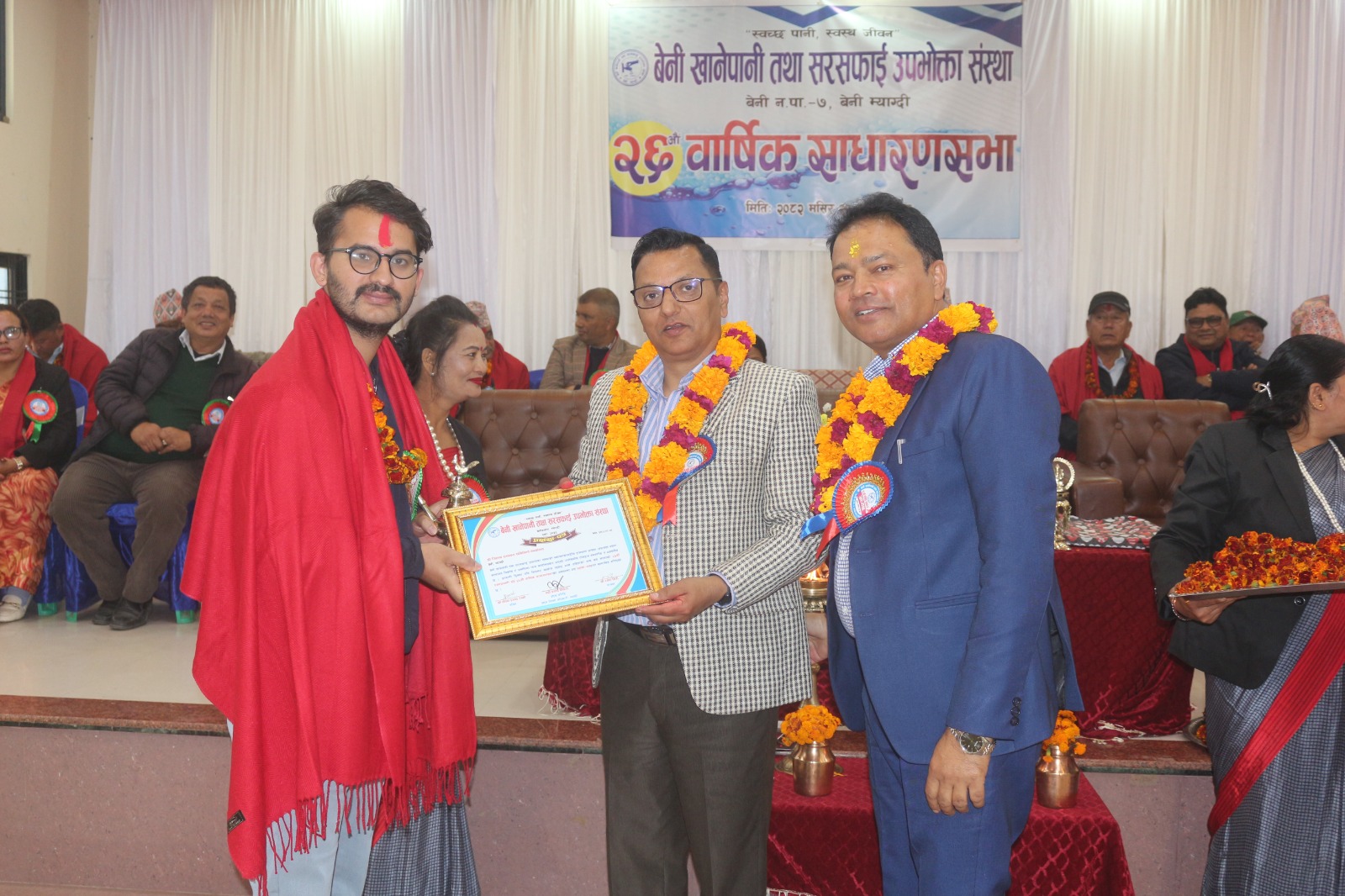 म्याग्दी सदरमुकाम बेनी स्थित बेनी खानेपानी तथा सरसफाई उपभोक्ता संस्थाको २६ औं वार्षिक साधारणसभा सम्पन्न भएको छ । संस्थाको बेनीमा शनिबार सम्पन्न साधारणसभामाको अवसरमा विभिन्न व्यक्ती ,संस्था र कर्मचारीलाई सम्मान सँगै गलेश्वरधाम ज्येष्ठ नागरिक आश्रमलाई आर्थिक सहयोग गरिएको छ ।