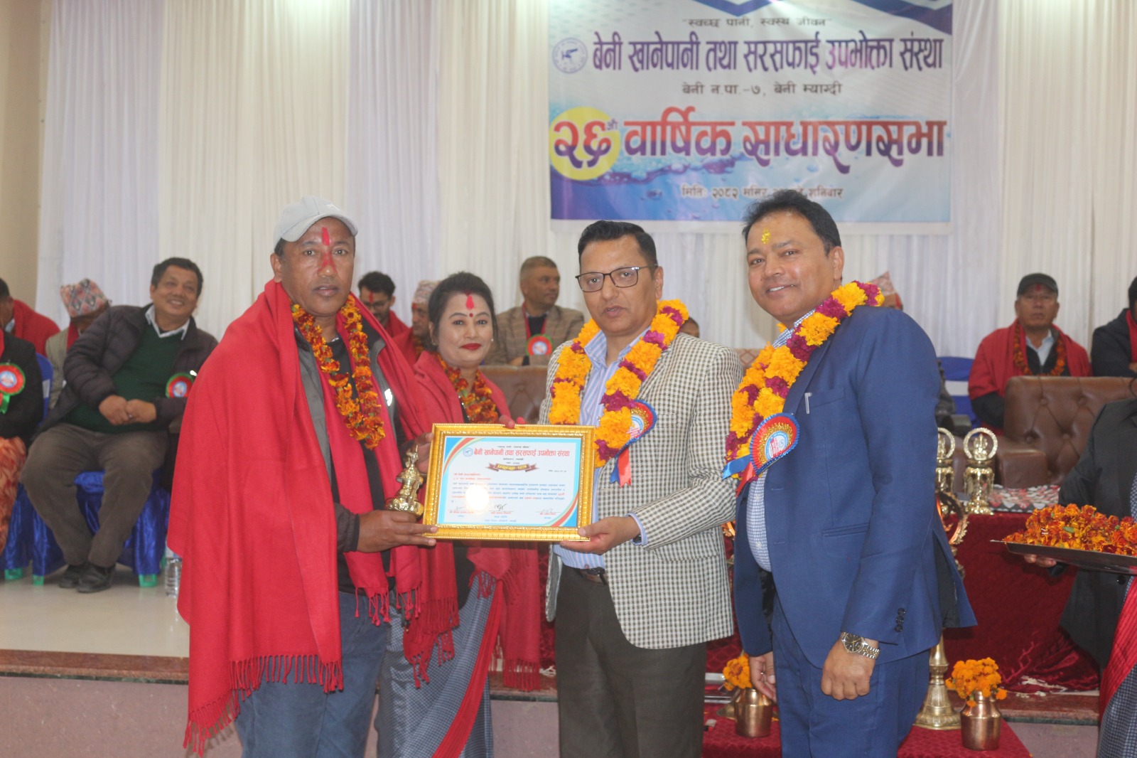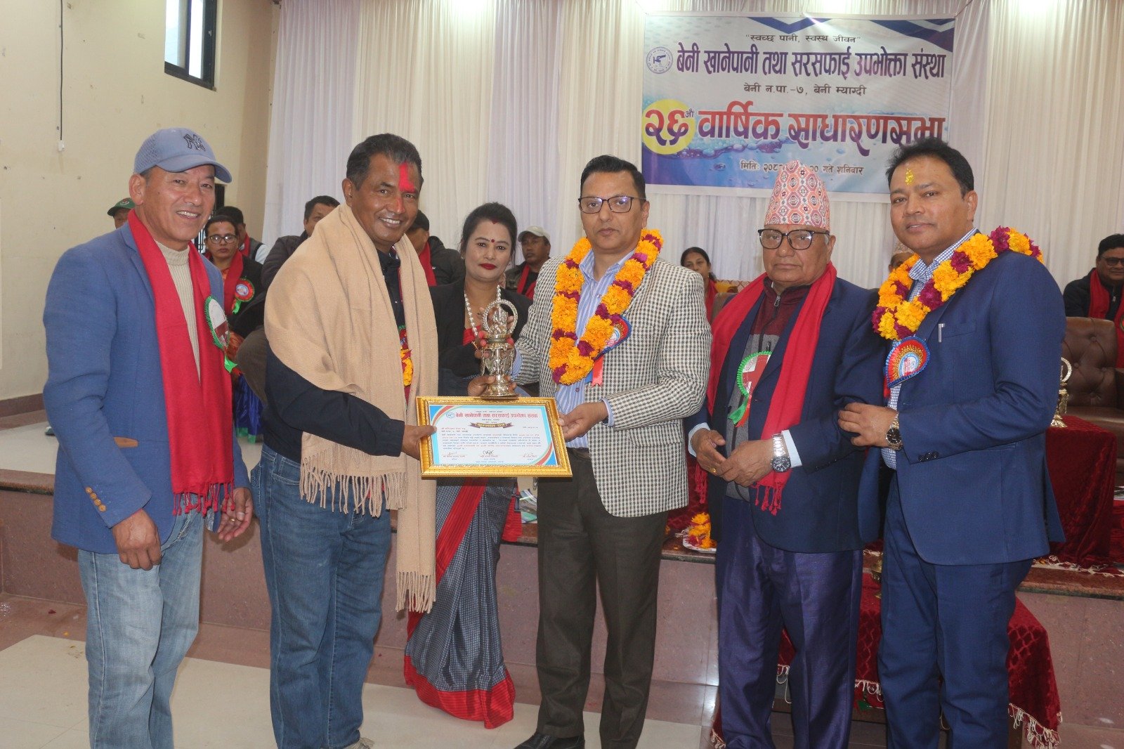 म्याग्दी सदरमुकाम बेनी स्थित बेनी खानेपानी तथा सरसफाई उपभोक्ता संस्थाको २६ औं वार्षिक साधारणसभा सम्पन्न भएको छ । संस्थाको बेनीमा शनिबार सम्पन्न साधारणसभामाको अवसरमा विभिन्न व्यक्ती ,संस्था र कर्मचारीलाई सम्मान सँगै गलेश्वरधाम ज्येष्ठ नागरिक आश्रमलाई आर्थिक सहयोग गरिएको छ ।