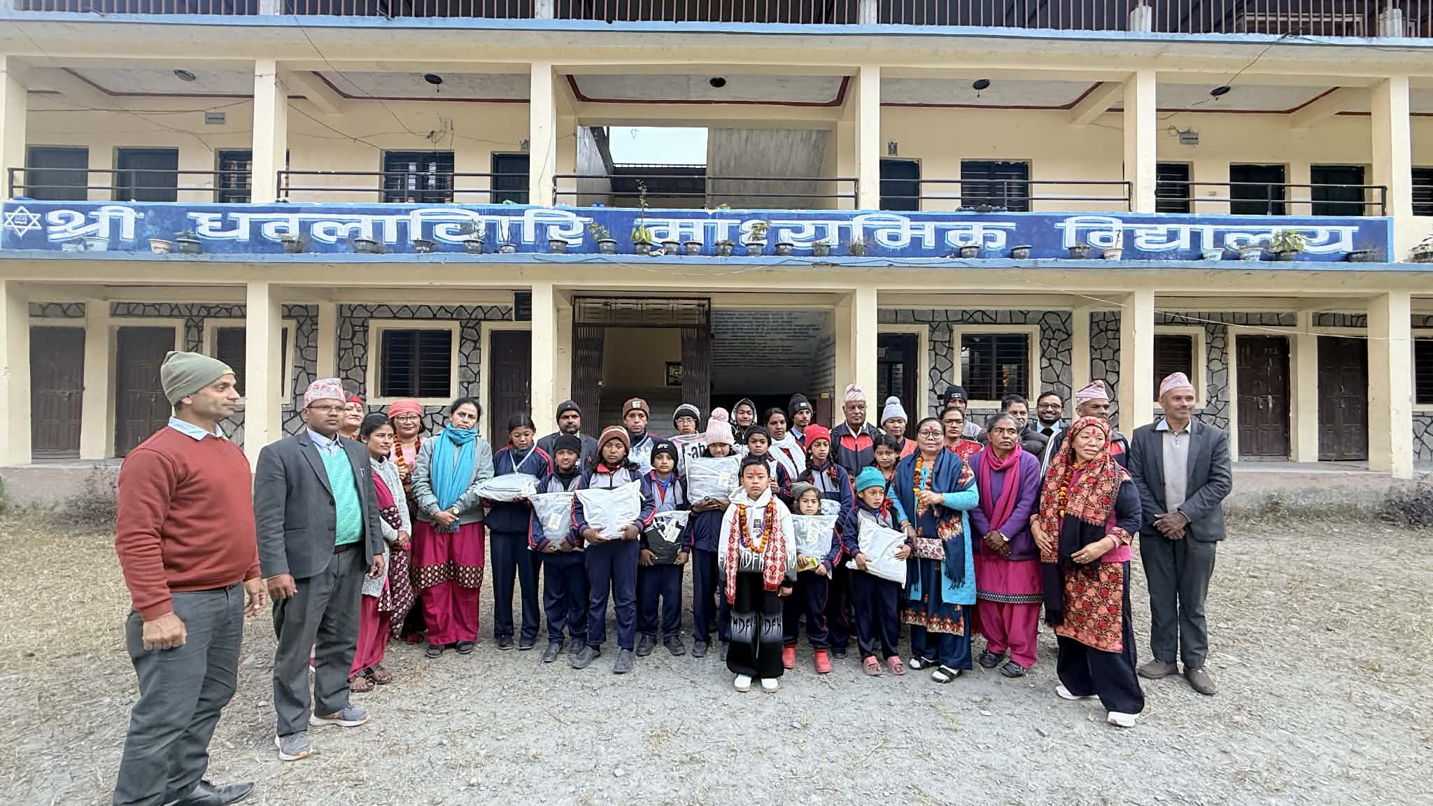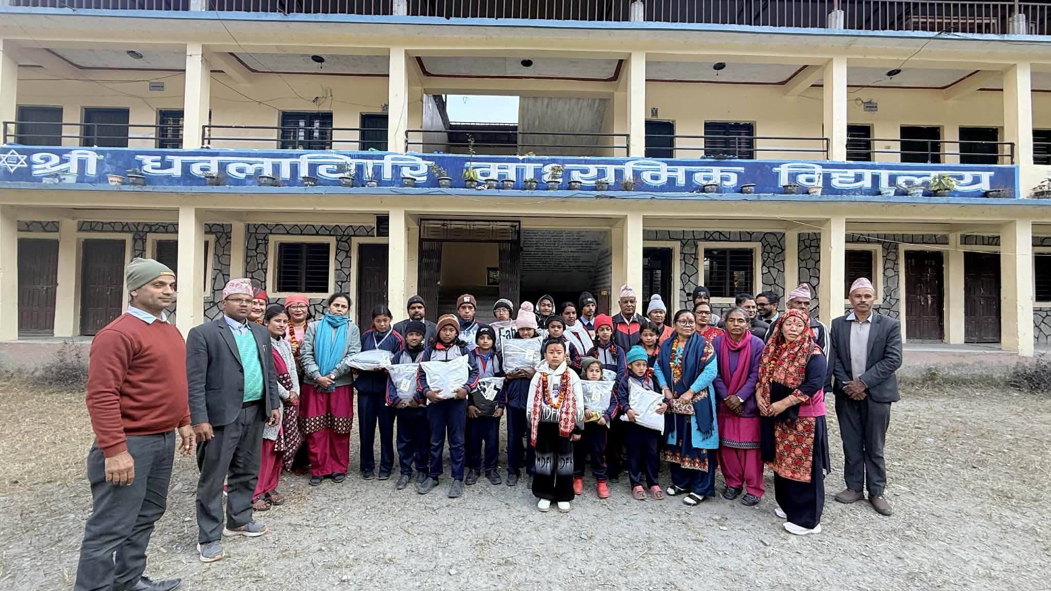 शुक्रबार विद्यालयमा एक कार्यक्रम गरी मालिका गाउँपालिका–६,दुखुबेसी घर भई हाल बेनी नगरपालिका–७ इन्द्रेणी टोलमा बस्ने ९ बर्षिय सामुएल रोकाको जन्मदिनको अवसरमा हाल अस्टेलियामा रहेका सुवास रोका,मेलिना रोकाले बहिरा स्रोत कक्षामा अध्ययनरत १२ जना बालबालिका र एक अभिभावकविहिन विद्यार्थीलाई ३३ हजार बराबरको न्यानो कपडा सहयोग गर्नुभएको हो ।