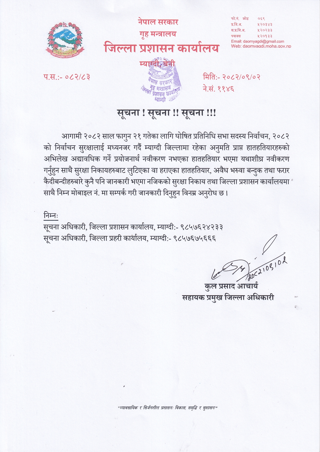 जिल्ला प्रशासन कार्यालय म्याग्दीले इजाजत पत्र लिएका हातहतियारको नवीकरण गर्न निर्देशन जारी गरेको छ । आसन्न प्रतिनिधिसभा निर्वाचनलाई लक्षित गरी बुधबार सूचना जारी गर्दै कार्यालयले हतियारसहित स्वयम् उपस्थित भएर नवीकरण गर्न निर्देशन दिएको सहायक प्रमुख जिल्ला अधिकारी कुलप्रसाद आचार्यले बताउनुभयो ।
