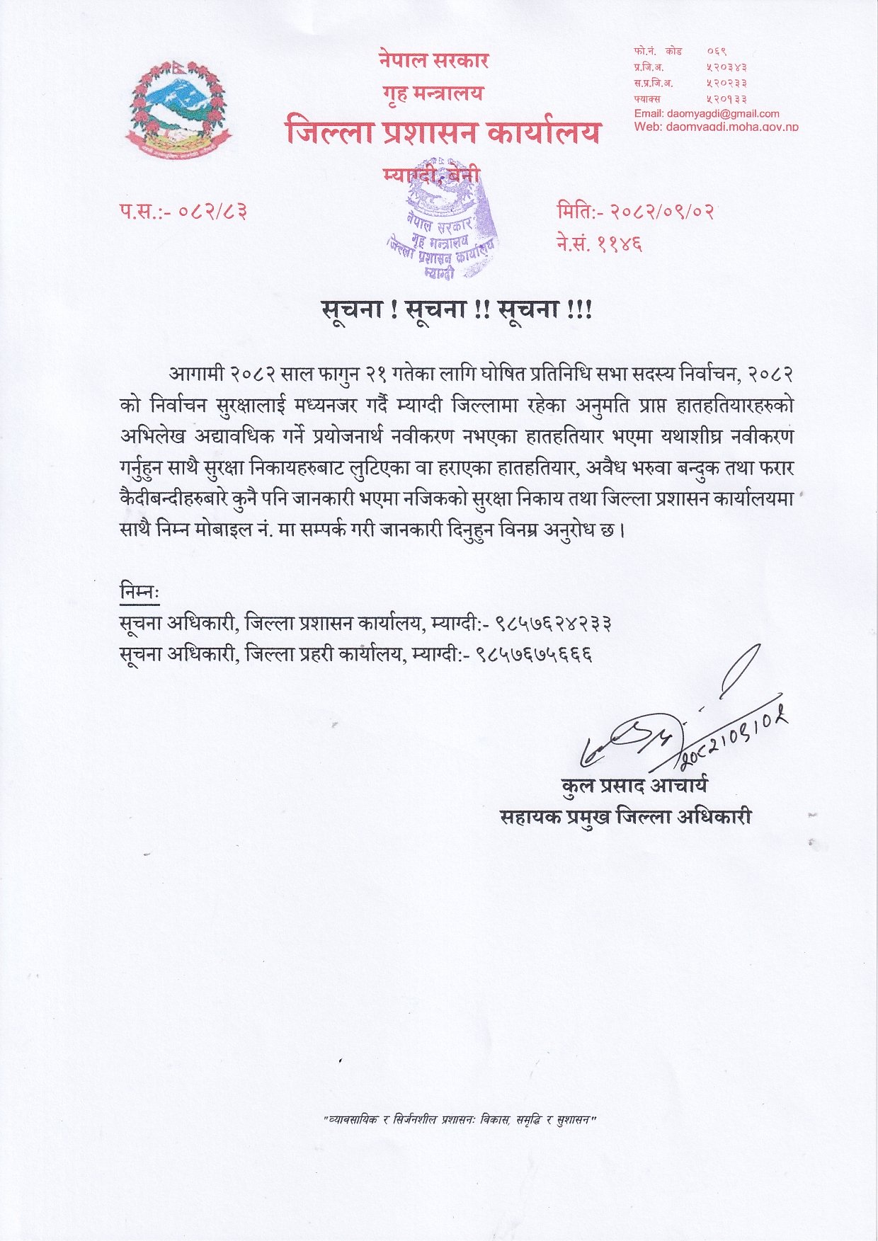 जिल्ला प्रशासन कार्यालय म्याग्दीले इजाजत पत्र लिएका हातहतियारको नवीकरण गर्न निर्देशन जारी गरेको छ । आसन्न प्रतिनिधिसभा निर्वाचनलाई लक्षित गरी बुधबार सूचना जारी गर्दै कार्यालयले हतियारसहित स्वयम् उपस्थित भएर नवीकरण गर्न निर्देशन दिएको सहायक प्रमुख जिल्ला अधिकारी कुलप्रसाद आचार्यले बताउनुभयो ।