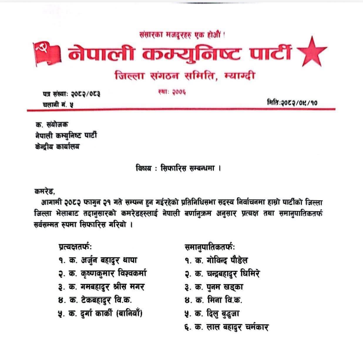 नेपाली कम्युनिष्ट पार्टी (नेकपा) म्याग्दीले आगामी फागुन २१ गते घोषणा भएको प्रतिनिधीसभा सदस्य निर्वाचनका लागि उमेद्वारको नाम सिफारिस गरेको छ ।