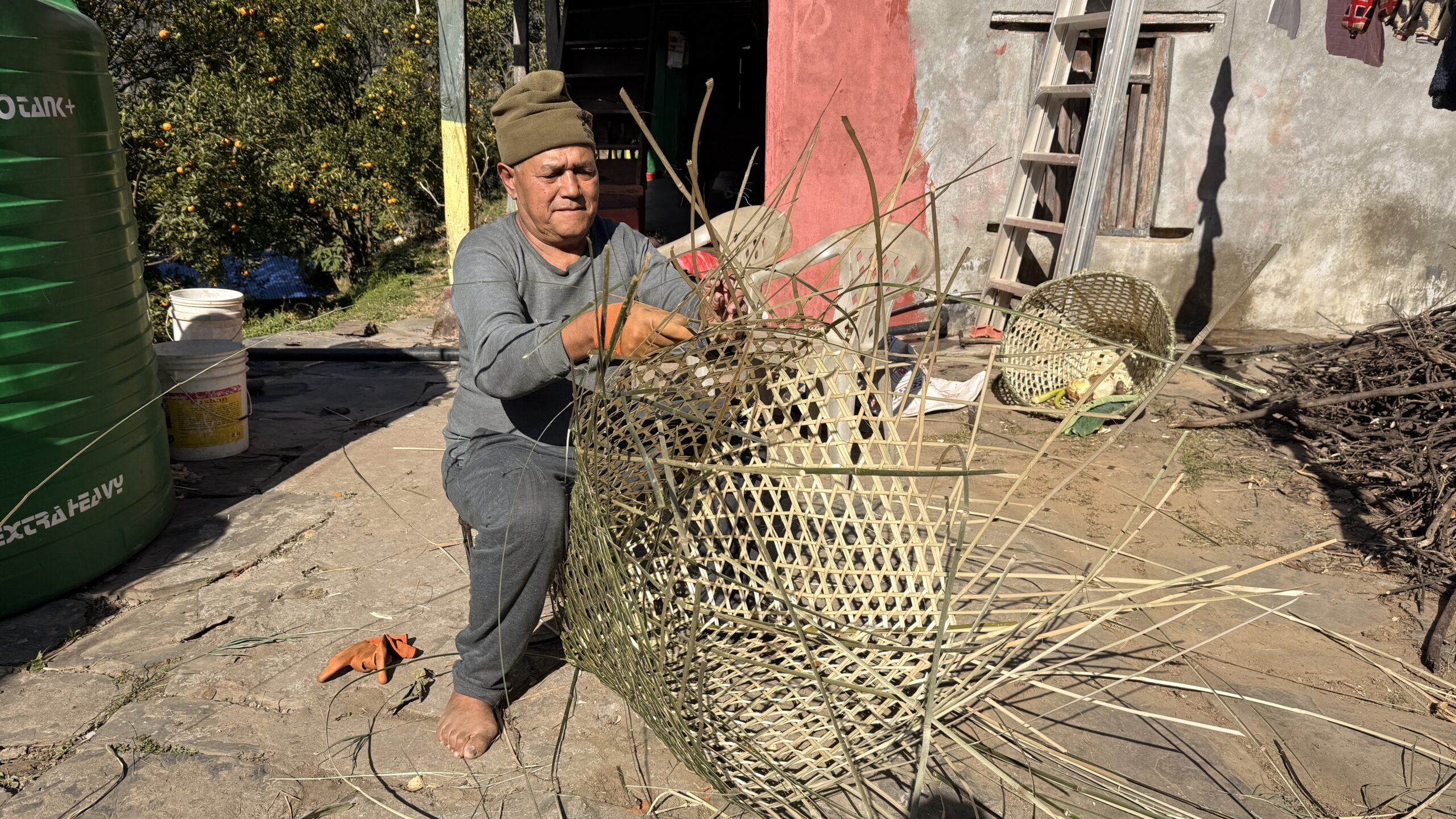 म्याग्दीको बेनी नगरपालिका-३ मरेकमा डोको बुन्दै स्थानीय अगुवा कृषक पदमबहादुर खत्री । गाउँमा बार्षिक १५ लाखभन्दा बढीको सुन्तला बिक्री गर्ने कृषक खत्रीले सुन्तला बगैंचासँगै फुर्सदमा आफ्नो हातमा रहेको सीप प्रयोग गरी घरमा आवश्यक पर्ने डोको बुन्ने गरेको बताउनुहुन्छ । ग्रामिण क्षेत्रमा घासँदाउरा संकलन सहित अन्य प्रयोजनका लागि डोको, ढालो, थुन्से, भकारीलगायत सामग्री बनाएर बुढापाकाले समय विताउने गर्दछन् । तस्वीर हरिकृष्ण गौतम