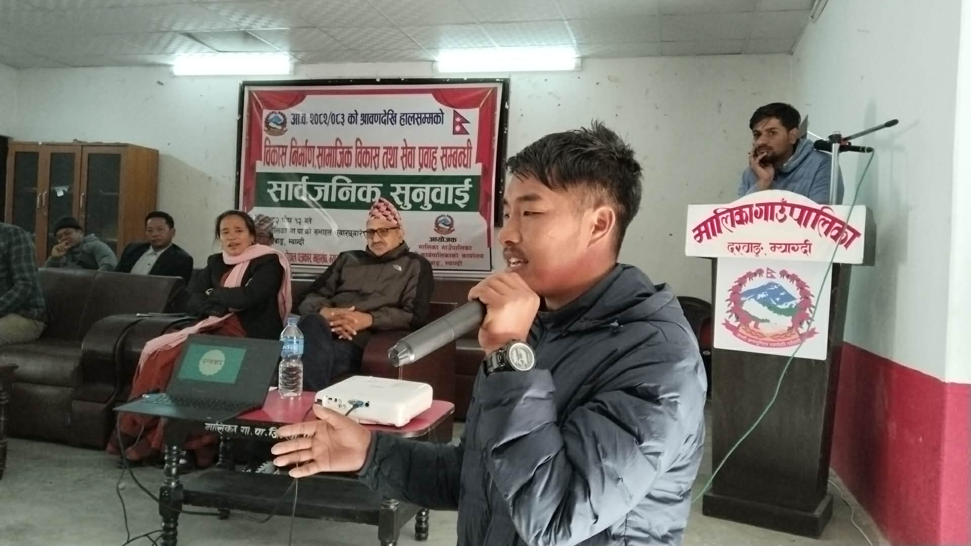 गाउँपालिकाले आयोजना गरेको सार्वजनिक सुनुवाई कार्यक्रममा जनसहभागिताको सन्दर्भमा म्याग्दी उद्योग बाणिज्य संघ मालिका बजार इकाइका उपाध्यक्ष समेत रहनु भएका सापकोटाले सवाल उठाउनु भएको थियो । उहाँले हरेक वडाबाट कम्तिमा पनि ३ जना सेवाग्राही र जनप्रतिनिधि अनिवार्य भएको खण्डमा उचित हुने धारणा राख्दै ससरिर उपस्थित गराउन नसकेको खण्डमा अडियो वा भिडियो मार्फत पनि प्रश्न राख्ने व्यवस्था गर्न माग गर्नु भएको थियो ।