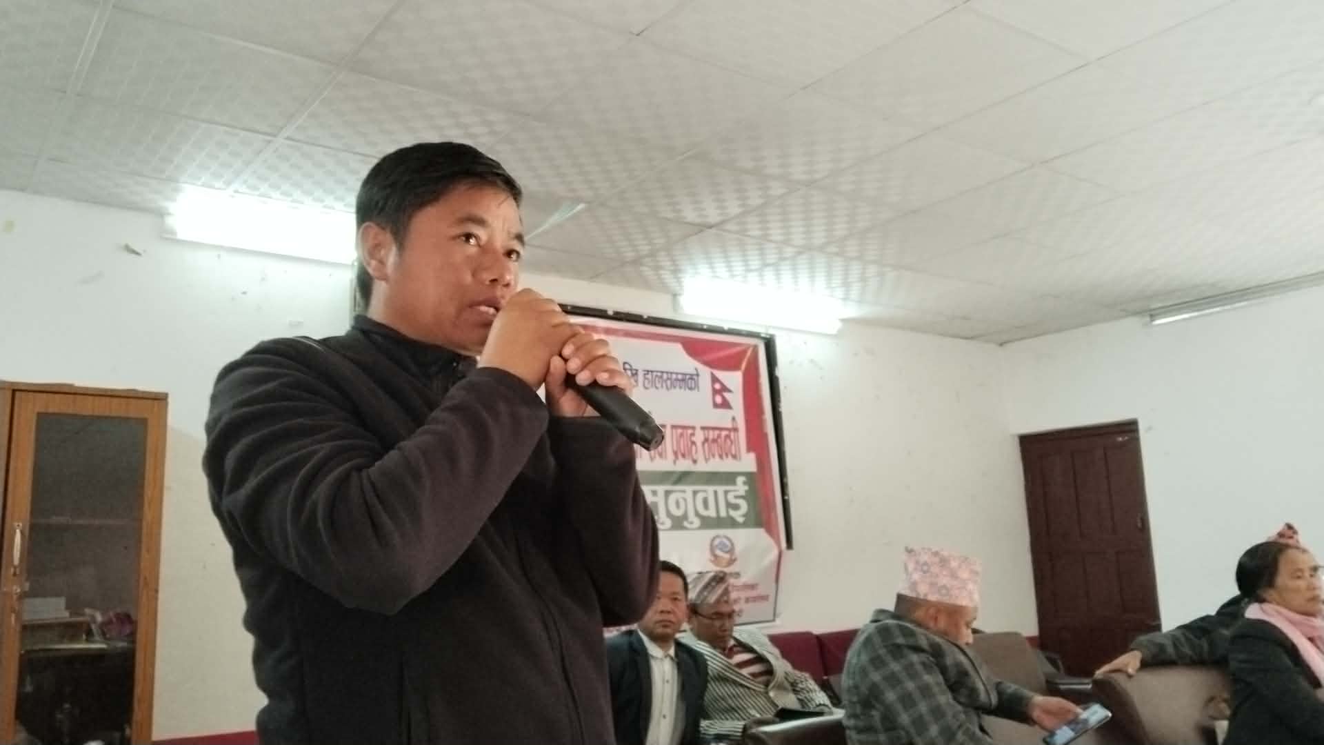 उहाँले उपभोक्ता समिति आफै नोक्सानी व्यहोरेर काम गर्नु पर्ने र लेखा शाखामा भुक्तानीका लागि जाँदा अनावश्यक सास्ती दिने गरेको गुनासा गर्नु भएको थियो । सहभागीहरुले स्थानीय स्तरमा मगरहरुको बाहुल्य ज्यादा भएको हुनाले मगर भाषाको संरक्षण र सम्बद्र्धनमा पनि पालिकाले काम गर्नु पर्नेमा जोड दिनु भएको थियो ।