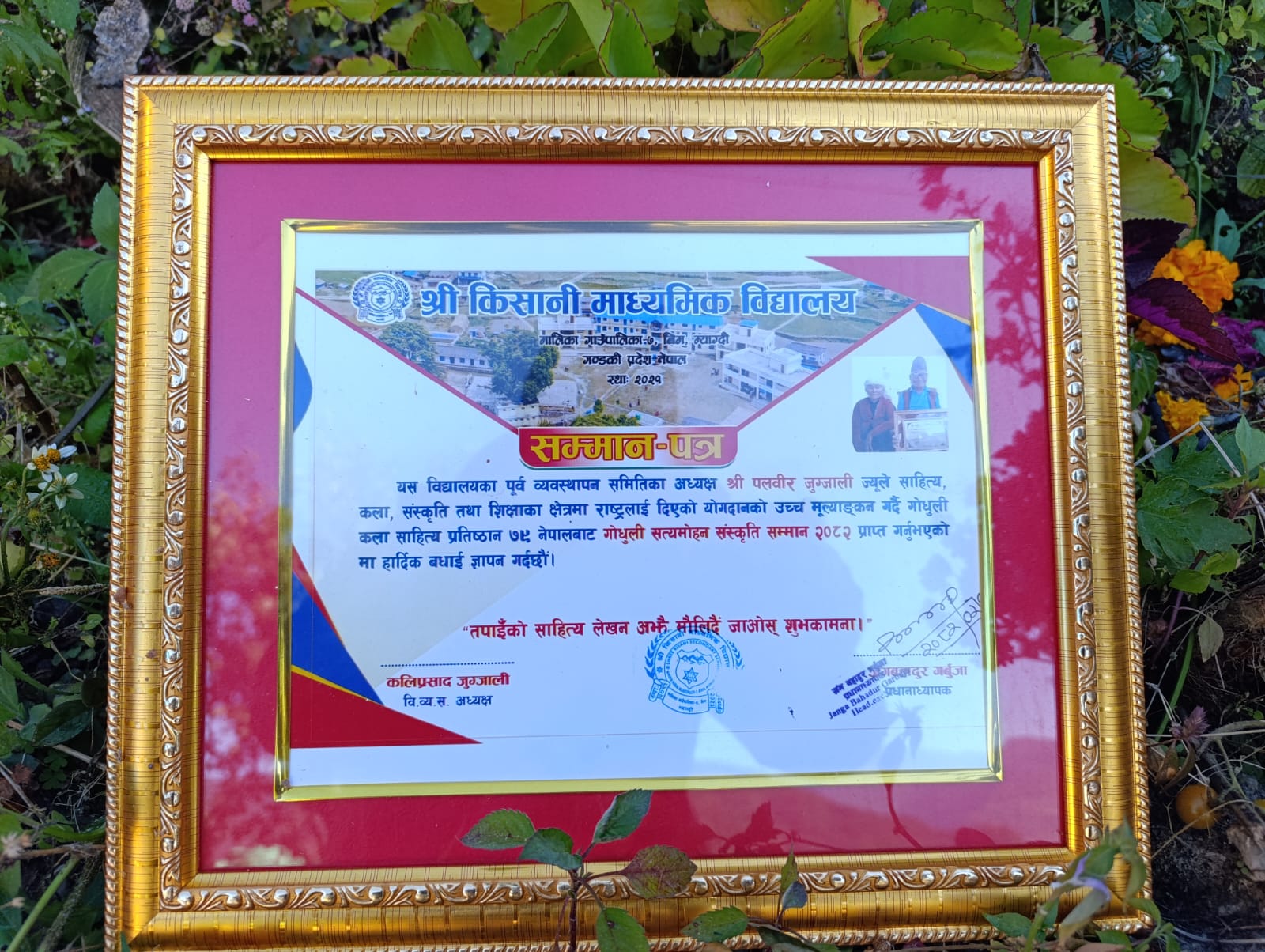उहाँको यही क्षमताको उच्च मूल्याङ्कन गरी वि.सं. २०८२ साल वैशाख २६ गते शुक्रबारका दिन प्रज्ञा भवन कमलादीमा गोधूलि कला साहित्य प्रतिष्ठानद्वारा गोधूलि सत्यमोहन संस्कृति सम्मान पुरस्कारबाट सम्मानित हुनुभएको हो । वास्तवमा हाम्रो बिम गाउँ सामाजिक, साँस्कृतिक, आर्थिक, राजनैतिक, धार्मिक, आध्यात्मिक मात्र नभई साहित्यिक रुपले पनि धनी छ भन्ने कुरा साहित्य प्रतिष्ठानले जुग्जालीलाई उच्च सम्मान गर्नुले पुष्टि गरिरहेको छ ।