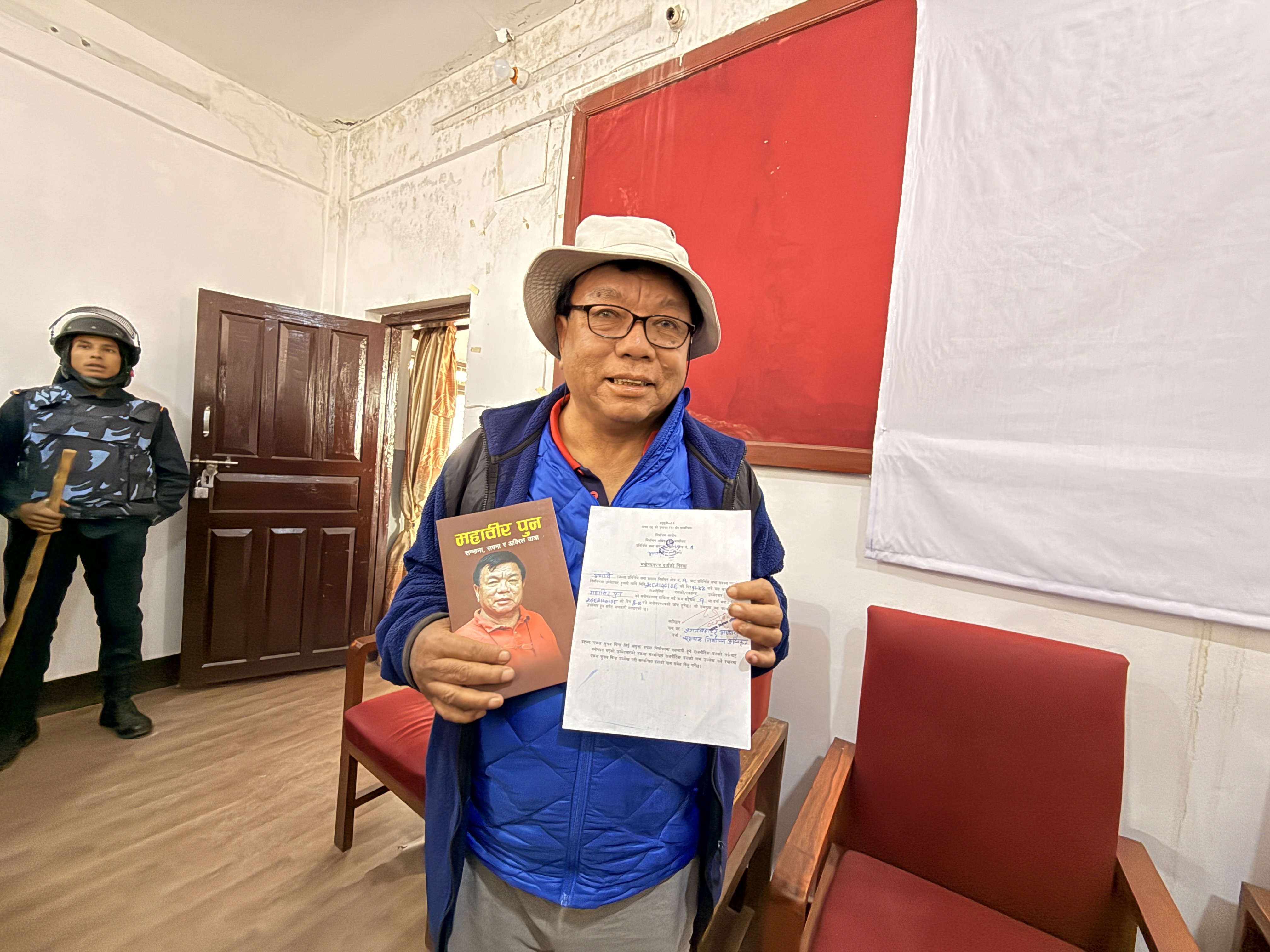 दुई दिन अगाडीसम्म उम्मेदवारी दिन अनेक प्रस्ताप आउँदा अस्वीकार गर्नुभएका महावीर पुन मंगलबार विहान सबैभन्दा पहिला गृहजिल्ला म्याग्दीको मुख्य निर्वाचन अधिकृतको कार्यालयमा पुग्नुभयो । प्रस्तावक रिलबहादुर पुन र सर्मथक चित्रबहादुर पुनलाई लिएर मुख्य निर्वाचन अधिकृतको कार्यालयमा पुग्नुभएका महावीरले करिब आधाघण्टाभन्दा बढी समय लिएर तोकिएको फारम भर्नुभयो ।