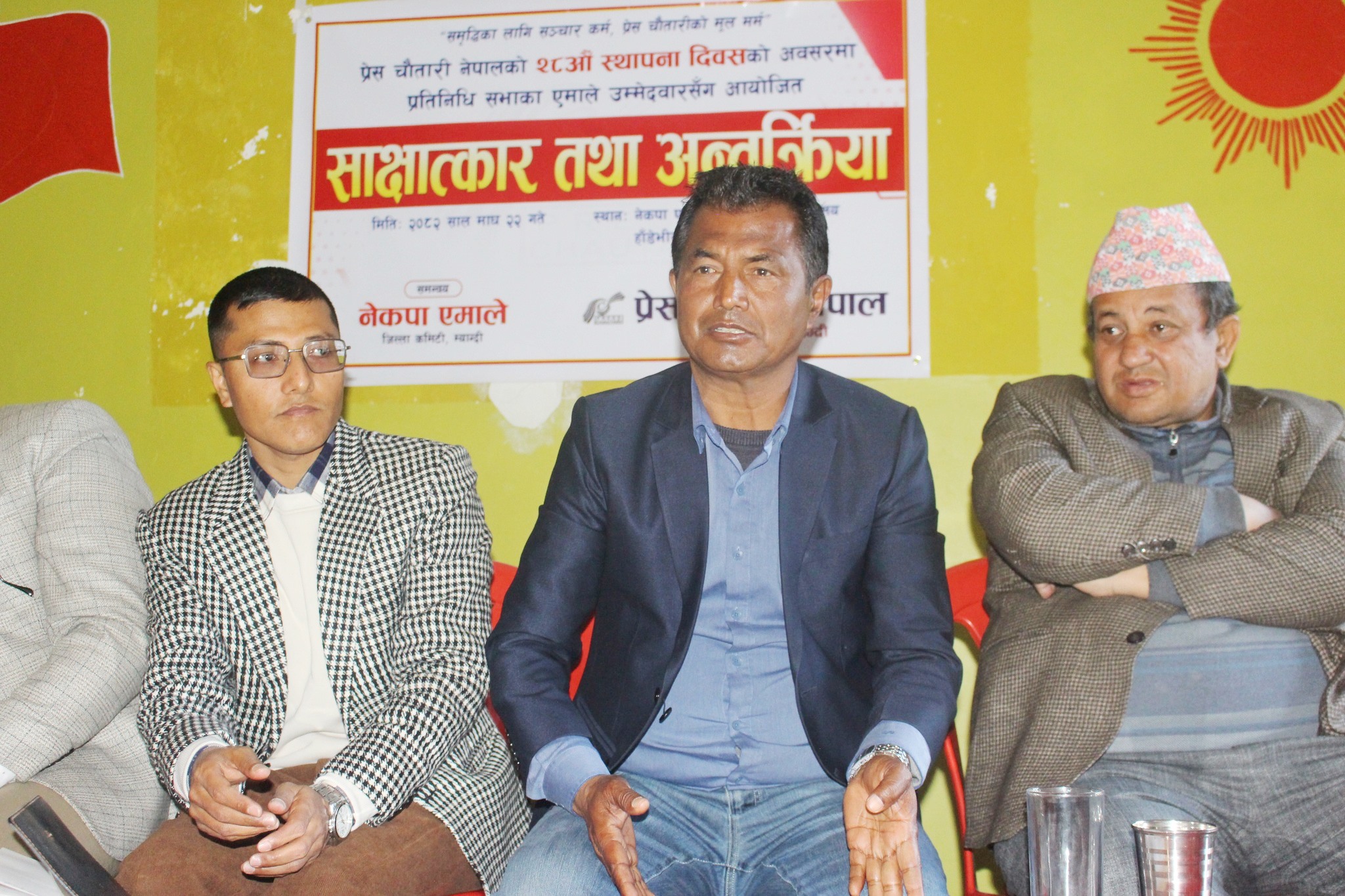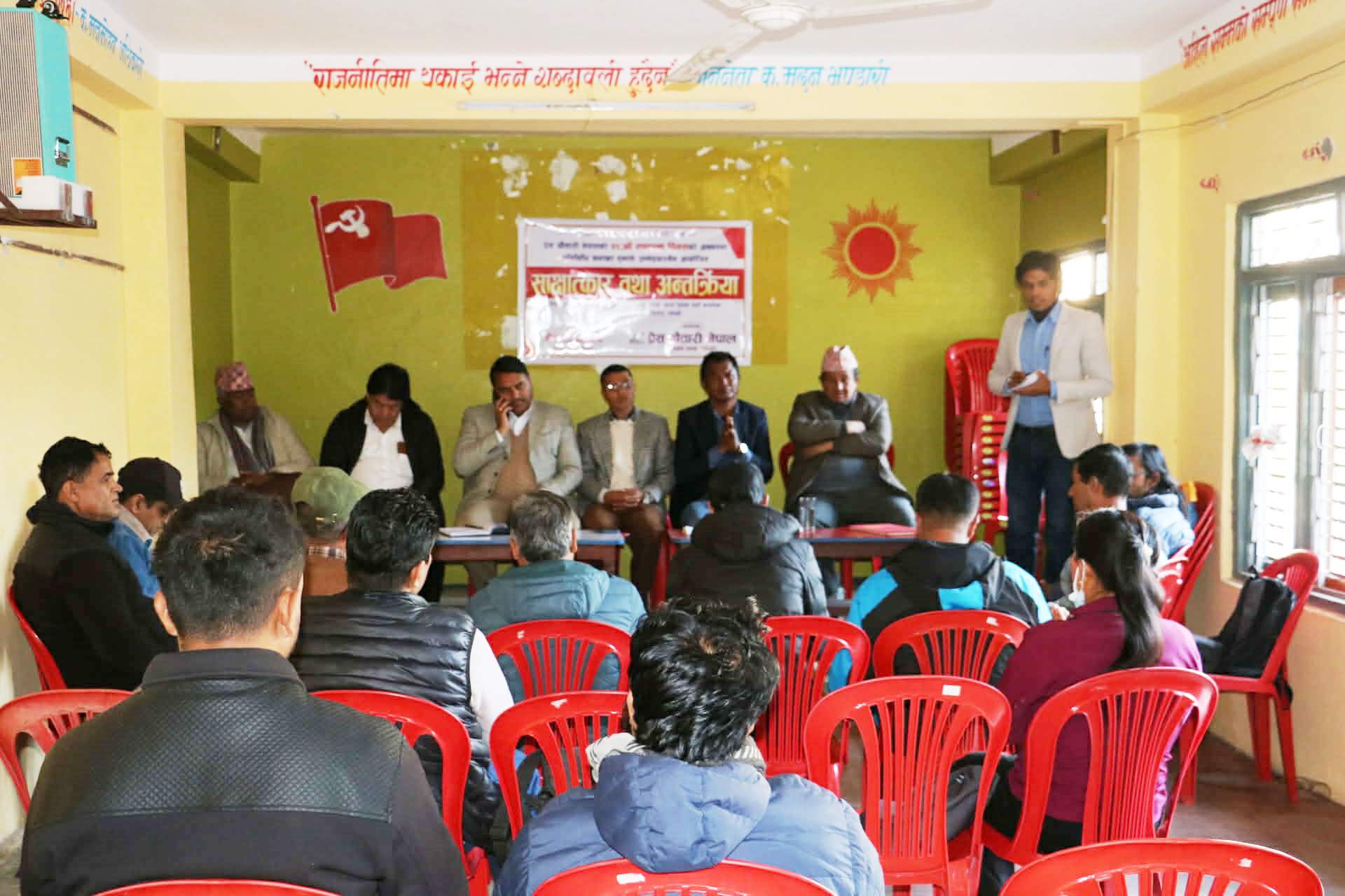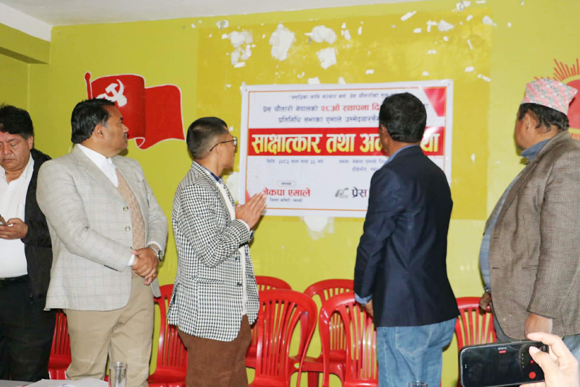 २०५१ सालबाटै देशमा एमाले नेतृत्वको सरकारले विकासको जग बसालेको हुँदा आउँदो निर्वाचनमा पनि एमालले जित्नुको विकल्न नभएको उहाँको भनाइ थियो । प्रेस चौतारी म्याग्दीका अध्यक्ष प्रताप बानियाँको अध्यक्षता एवं स्वागत र सचिव अमित विश्वकर्माको सञ्चालनमा सम्पन्न साक्षात्कार तथा अन्तत्र्रिmया कार्यक्रममा नेपाल पत्रकार महासंघ जिल्ला शाखा म्याग्दीका अध्यक्ष हरिकृष्ण गौतमले शुभकामना मन्तव्य व्यक्त गर्नुभएको थियो । कार्यक्रममा नेकपा एमाले गण्डकी प्रदेश कमिटीका सदस्य प्रकाश कार्की, एमाले म्याग्दीका उपाध्यक्ष प्रमोद श्रेष्ठ, बेनी नगरपालिका कमिटी अध्यक्ष बेलबहादुर कटुवाल लगायतको उपस्थिति रहेको थियो ।