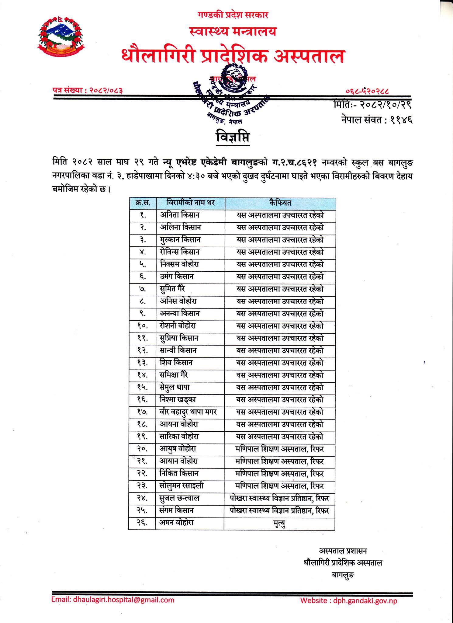 बागलुङ नगरपालिका–१, रामरेखामा सञ्चालित न्यू एभरेष्ट एकेडेमी स्कुलको विद्यार्थी बोकेको भ्यान बिहीबार दुर्घटनामा परेको हो ।