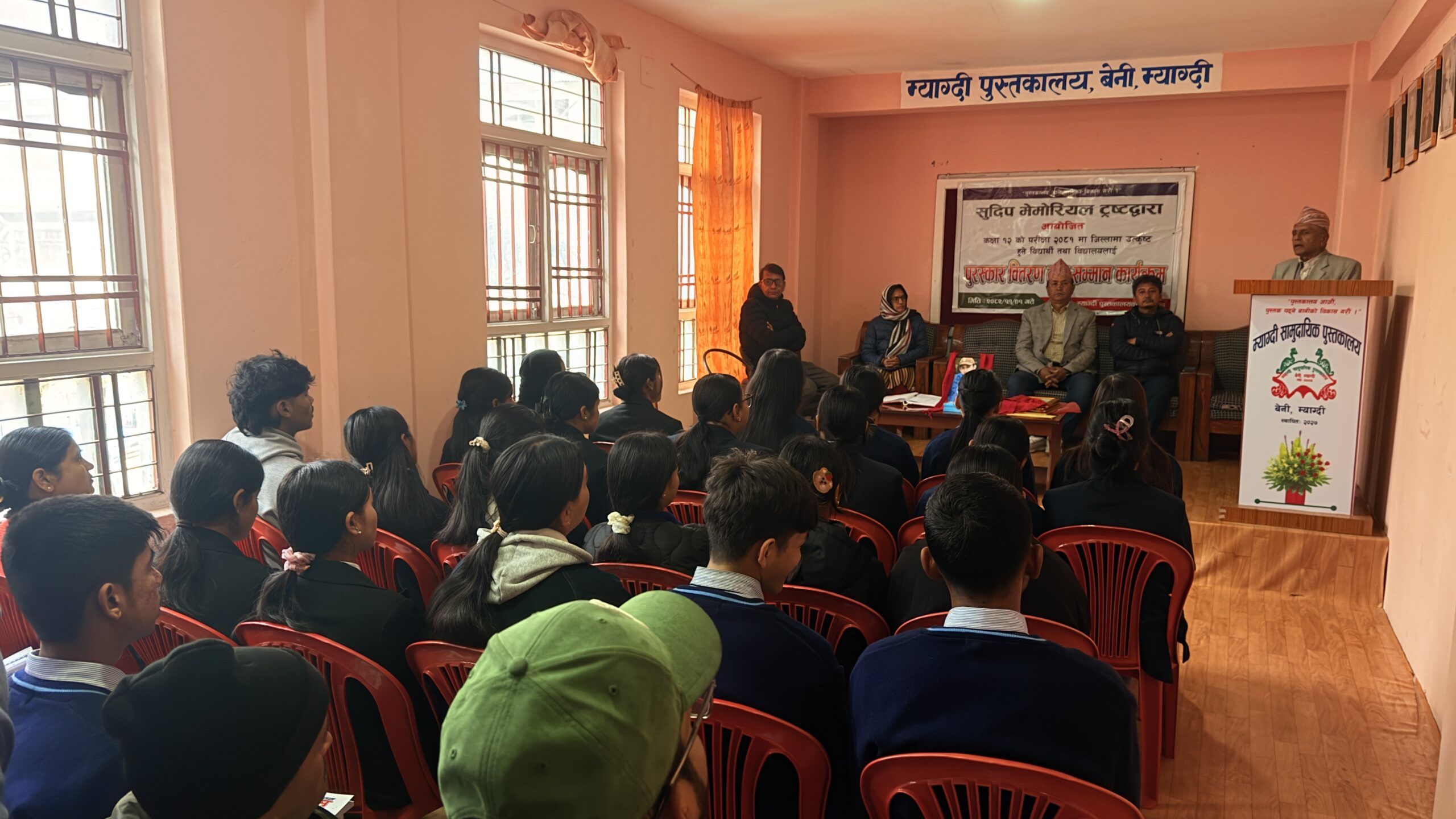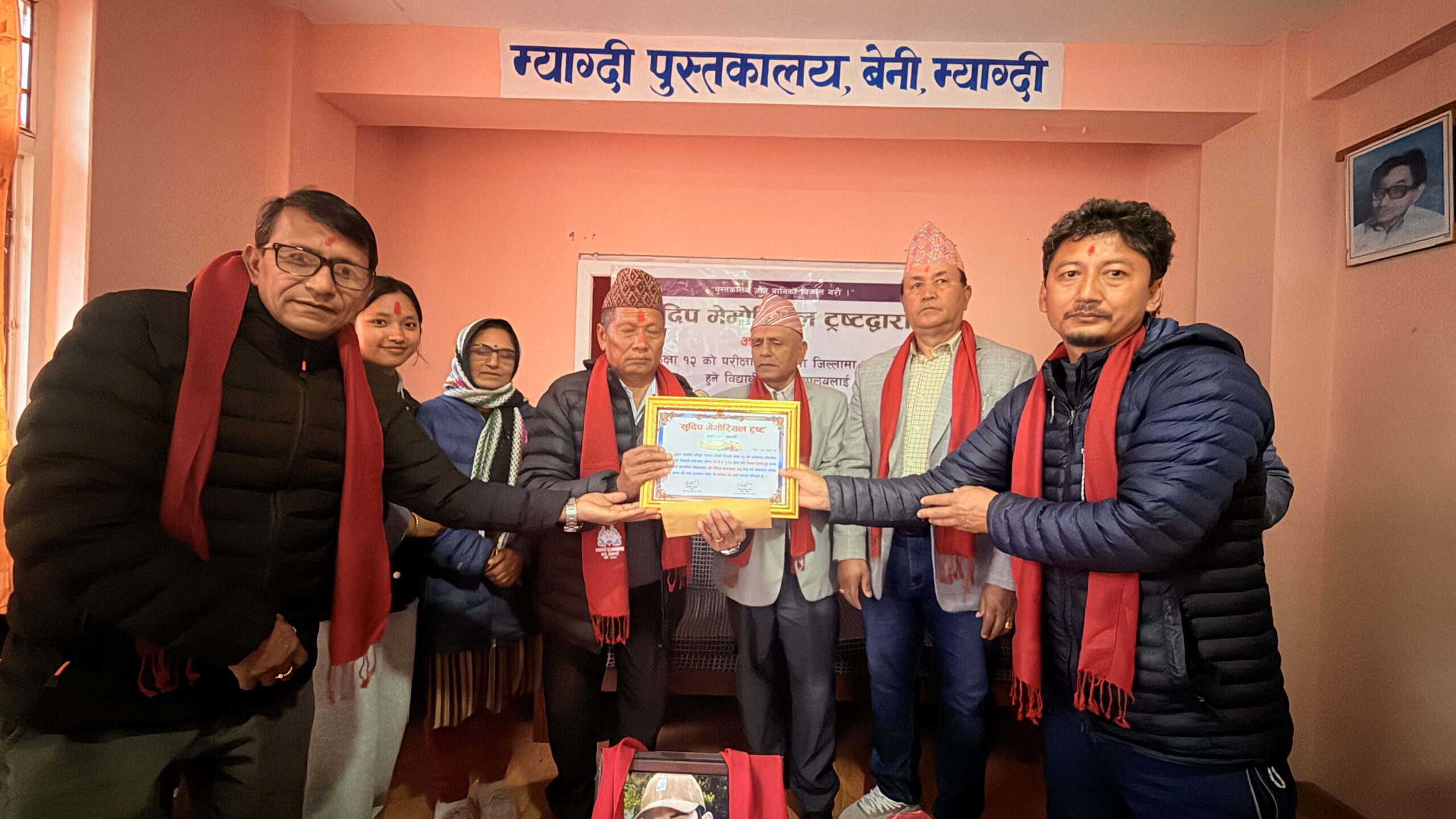 म्याग्दी पुस्तकालय अन्तरगत सञ्चालित कोषको शुक्रबार आयोजित एक कार्यक्रममा जिल्ला प्रथम हुने न्यु वेष्ट पोइन्ट आवासीय माविकी बर्खा थापा नेपाली (३.९१ जिपिए), प्रकाश माविका छात्र टेनिश छन्त्याल (३.८३ जिपिए)को सम्मान अभिभावकलाई बेनी नगरपालिकाका प्रबक्ता एवम् वडा नं ७ का अध्यक्ष रमेशकुमार श्रेष्ठले क्रमशः नगद रु.१० हजार, ५ हजार नगद तथा प्रमाणपत्रले सम्मान गरेका थिए ।