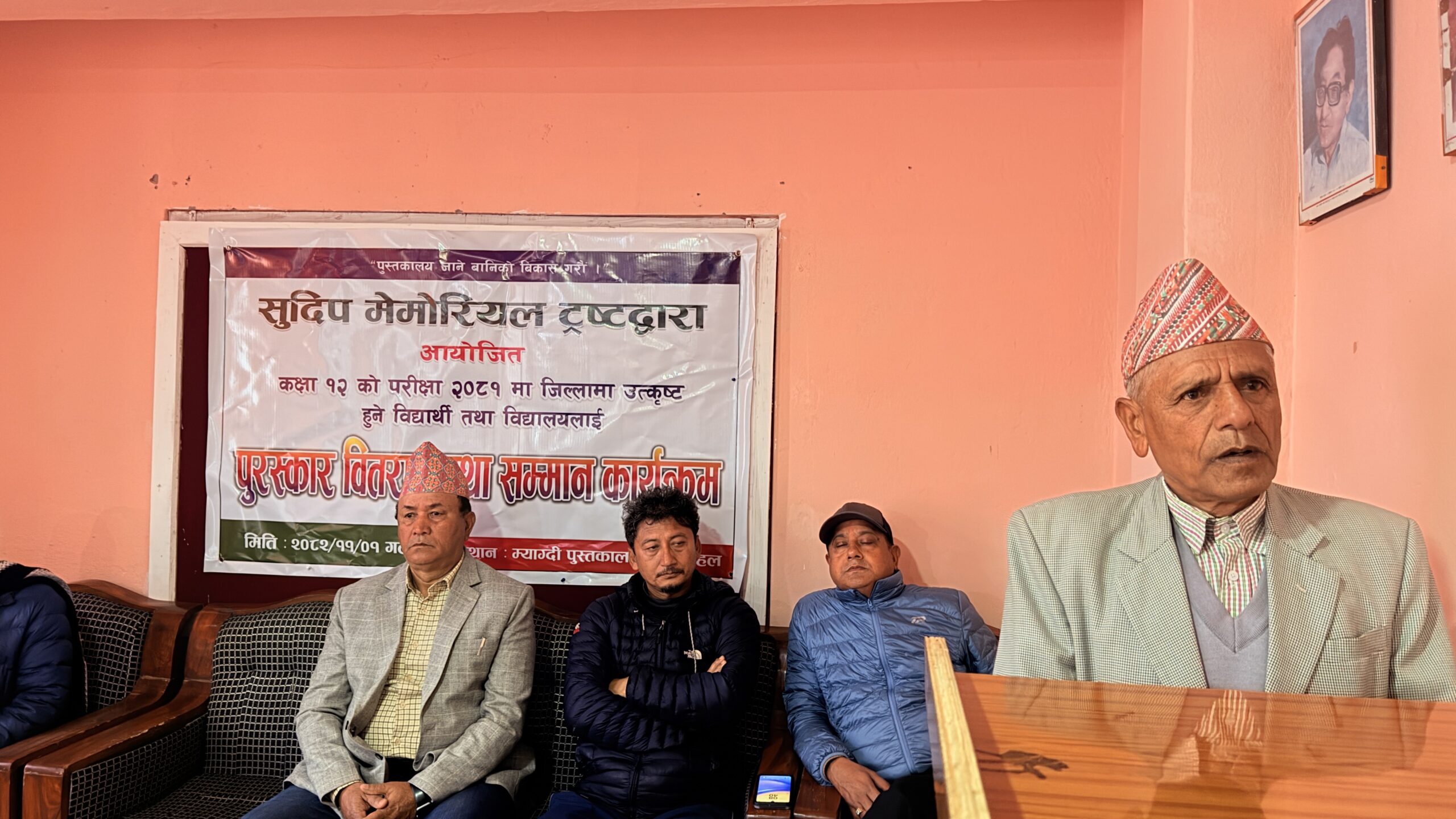 सुदिप रावल स्मृति कोषको १७ औ स्मृति दिवसको अवसरमा गतबर्षको दश जोड दुईको परीक्षामा म्याग्दी जिल्लामा सर्वोकृष्ट अंक प्राप्त गर्ने दुई जना विद्यार्थीलाई सम्मान तथा पुरस्कृत गरिएको छ ।