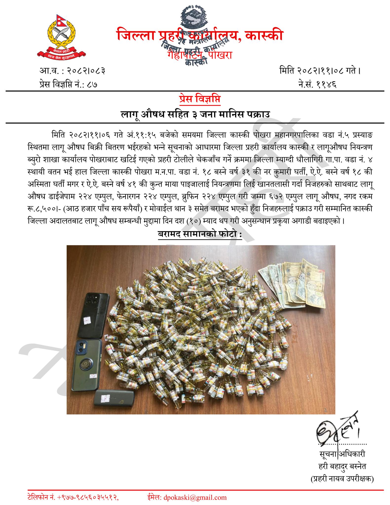 जिल्ला प्रहरी कार्यालय कास्की र लागुऔषध नियन्त्रण ब्युरो शाखा कार्यालय पोखराको संयुक्त टोलीले चेकजाँच गर्ने क्रममा म्याग्दीको धवलागिरी गाउँपालिका–४ स्थायी घर भई हाल पोखरा १८ बस्ने ३१ वर्षीया नरकुमारी घर्ती, १८ वर्षीया अस्मिता घर्ती मगर र ४१ वर्षीया कुन्तमाया पाइजा छन्।प्रहरीले उनीहरूको साथबाट डाइजेपाम २ सय २४ एम्पुल, फेनारगन २ सय २४ एम्पुल र ब्रुफिन २ सय २४ एम्पुल गरी कुल ६ सय ७२ एम्पुल लागुऔषध बरामद गरेको छ ।