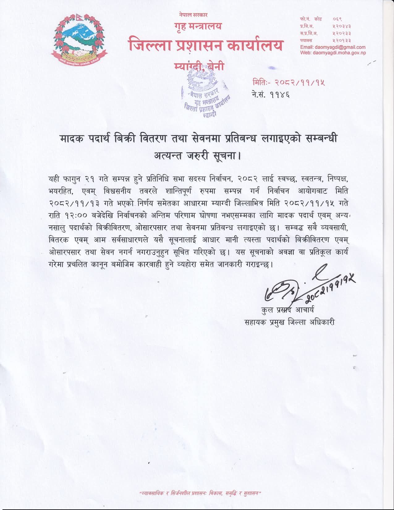 यही फागुन २१ गते हुने प्रतिनिधी सभा निर्वाचनको सुरक्षालाई मध्यनजर गर्दै म्याग्दी जिल्लामा निर्वाचन मतपरिणाम सार्वजनिक नहुदाँसम्म मदिराजन्य पदार्थको बिक्री–वितरण तथा सेवनमा पूर्णरूपमा रोक लगाइने भएको छ । जिल्ला प्रशासन कार्यालय म्याग्दीले फागुन १५ गतेदेखि अन्तिम नतिजा सार्वजनिक नहुदाँसम्म जिल्लाभित्र मदिराजन्य पदार्थको बिक्री–वितरण तथा सेवन गर्न रोक लगाएको हो ।