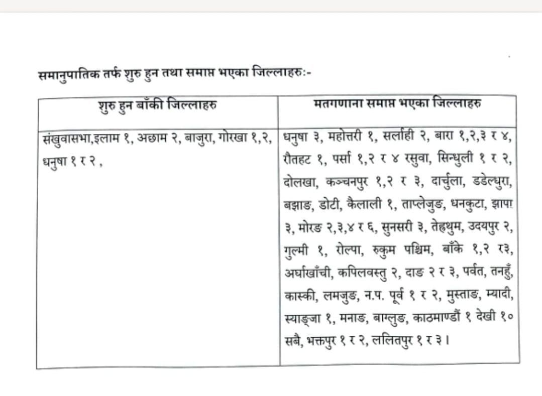 केही जिल्लाका निश्चित क्षेत्रहरूमा भने अझै मतगणना सुरु हुन बाँकी देखिएको छ। संखुवासभा, इलाम १, अछाम २ र बाजुरामा गणना सुरु हुन सकेको छैन। त्यस्तै गोरखाका १ र २ तथा धनुषाका १ र २ नम्बर क्षेत्रमा पनि समानुपातिकतर्फको मतगणना सुरु हुन बाँकी रहेको छ। नागरिक