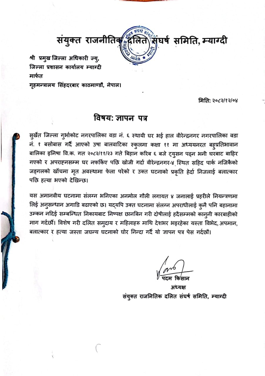 सुर्खेतमा कक्षा ११ मा अध्ययनरत छात्रा इनिशा वि.क.को बलात्कारपछि हत्या भएको घटनाप्रति विरोध जनाउँदै म्याग्दीका दलित अधिकारकर्मीहरुले सरकारको ध्यानाकर्षण गराएका छन् । संयुक्त राजनीतिक दलित संघर्ष समिति, म्याग्दीले बुधबार जिल्ला प्रशासन कार्यालयमार्फत गृहमन्त्रालयलाई ज्ञापनपत्र बुझाउँदै दोषीमाथि हदैसम्मको कारबाहीको माग गरेको हो ।
